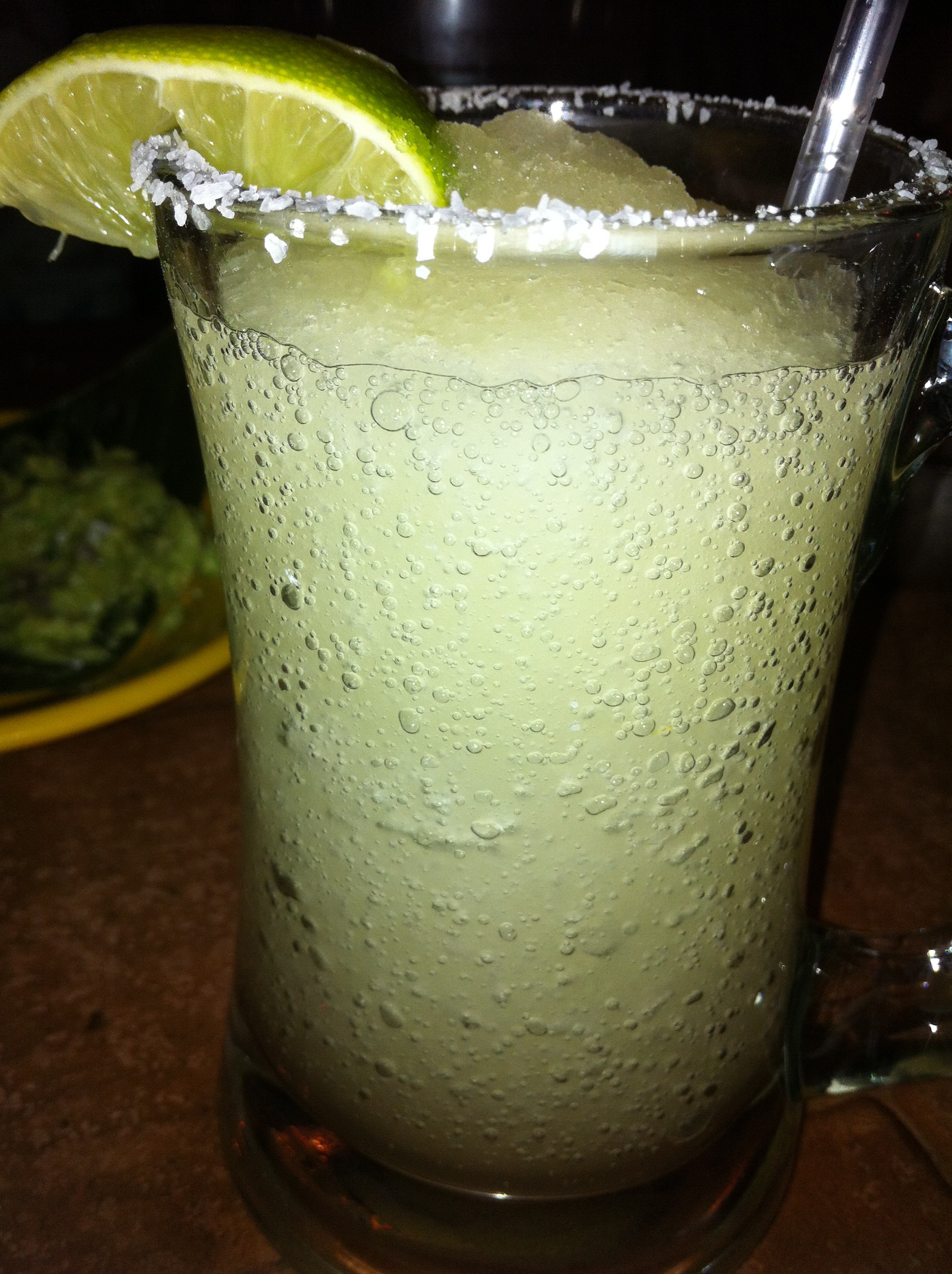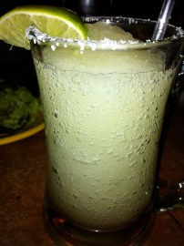 Our friend RB, who is in attendance tonight, has consumed his body weight in OTB margaritas, but my body does not like tequila, so I order a beer off the limited beer list. Everything on there is mass-produced, large-volume beers. Sweetwater brewery is less than five miles away–couldn’t OTB get some locally brewed beer? Anyway, when in Mexico, drink Mexican beer, so I get a Dos Equis Amber, which was served in a frosty-cold, eighteen ounce glass. The majority of the table gets a pitcher of frozen margaritas, and Eve has some of that. There’s hardly any alcohol in hers, which must explain how RB can drink so many of them. (There you go, RB, you have made the Date Night blog!)