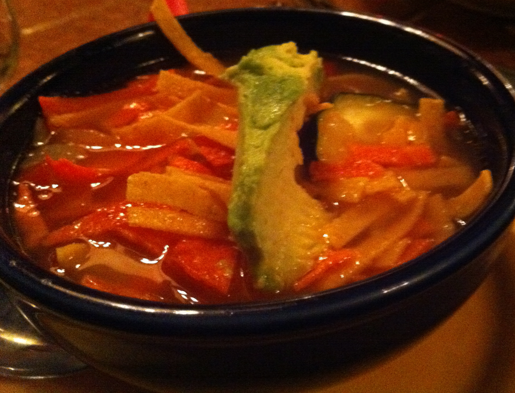 I will confess that I can’t eat a small amount of chips at a Mexican restaurant. Once I eat one, I have to eat the whole basket, and tonight is no different. These chips are very good, warm and lightly salted. And once we start eating them, the basket vanishes in just a few minutes. That’s OK, though, because they keep bringing you more. These things are so habit forming that I think they might add crack cocaine to the chips to make you keep eating them. We get two orders of guacamole for the table, which gives an excuse to eat even more chips.