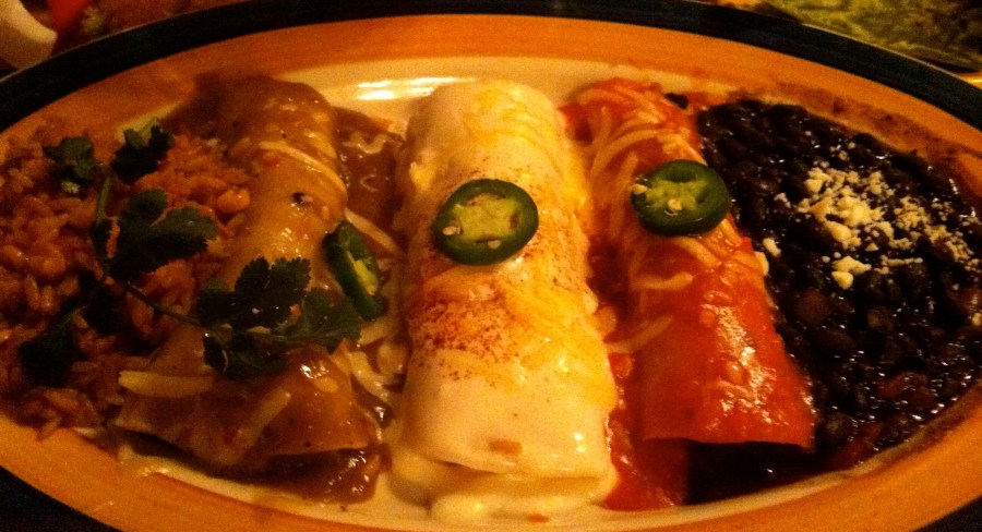 You can certainly get your fill of Mexican on this menu. There is something for everyone, with burritos, enchiladas, empanadas, tostadas and all sorts of tacos. You can make combos out of most of the menu items, and that’s what most of us do. I get the Bandera, which is an three enchilada combo featuring a brisket, chicken, and pork enchiladas covered in different sauces. You get beans and rice with that too, making it quite filling. Eve builds a combo with chicken tortilla soup (she likes soup!) and a pair of chicken empanadas. They give you beans and rice with that as well. Other orders included a nice-looking vegetarian combo for the two vegetarians at the table (hey, vonNs, you just made to blog too!), an order of Dos Equis fish tacos, and a pepper jack enchilada, which RB managed to eat between his margaritas. Dessert was discussed, but never considered.