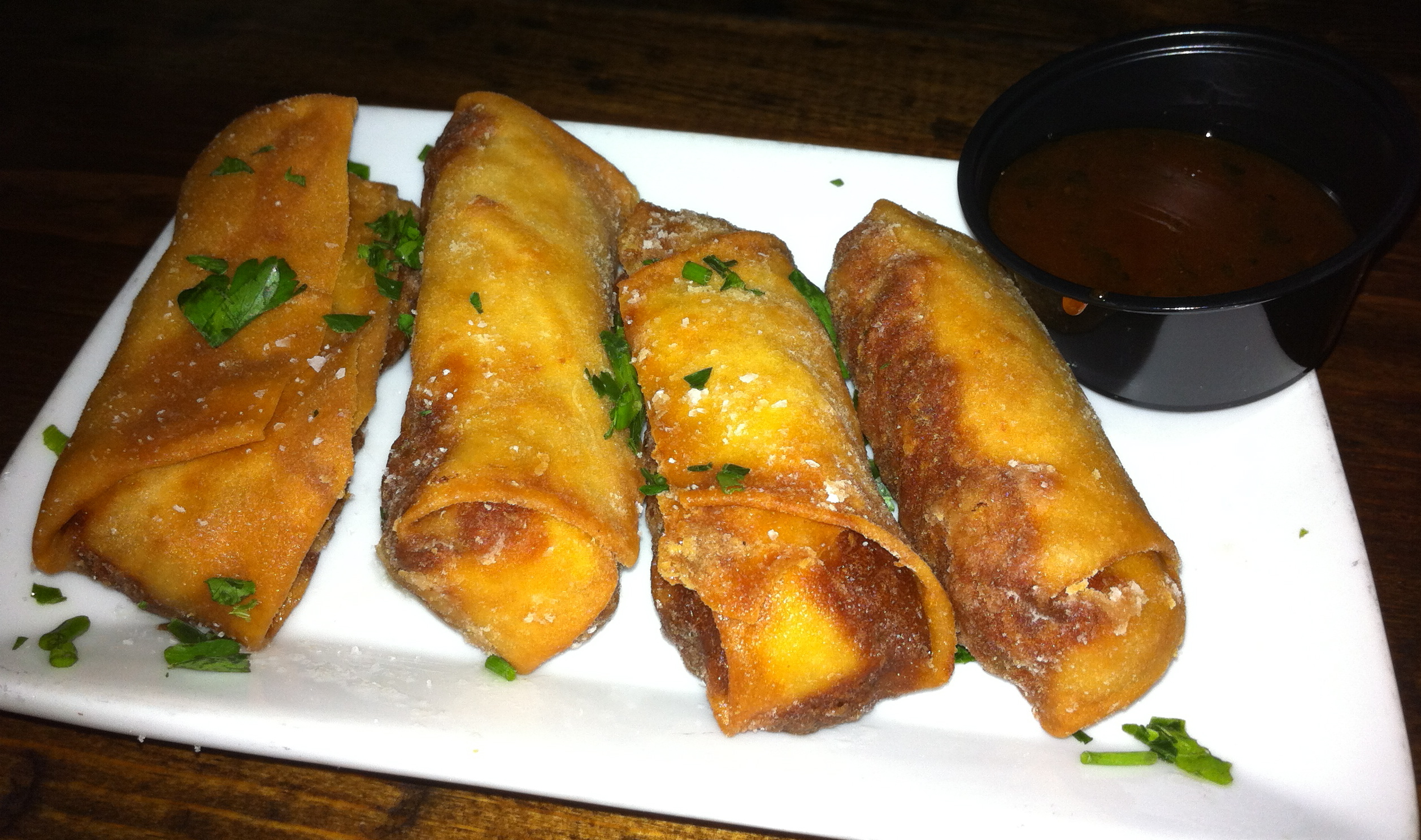 We love the presentation (each flight is 3 tulip glasses with about 4 ounces of beautiful brown beer) as much as we love the names (Brown Cow, and Box of Chocolates). The “Brown Cow” grouping is Dogfishhead IBA, Avery Ellie’s Brown and Terrapin Moo Hoo. The “Box of Chocolates” features Bell’s Cherry Stout, Terrapin Moo Hoo and Jared’s Peach Porter. We taste and do a little beer trading as we wait for our starters, the shrimp and pork spring rolls.