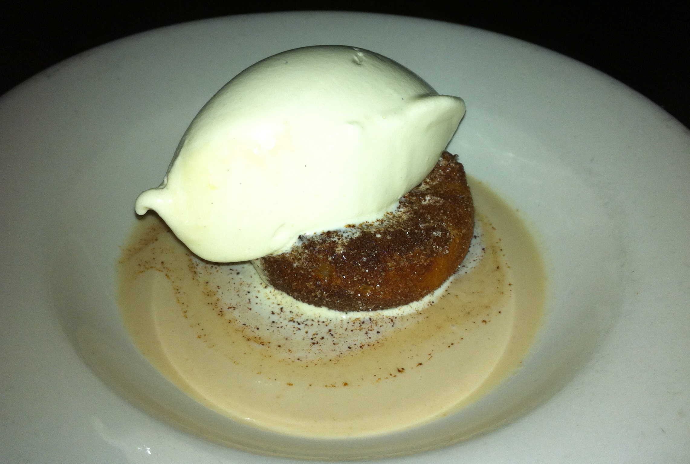 The waitress is probably ready to turn our table, so she delivers the check without asking if we want dessert. This does not deter us from ordering the hot apple beignet with home-made ice cream on top.