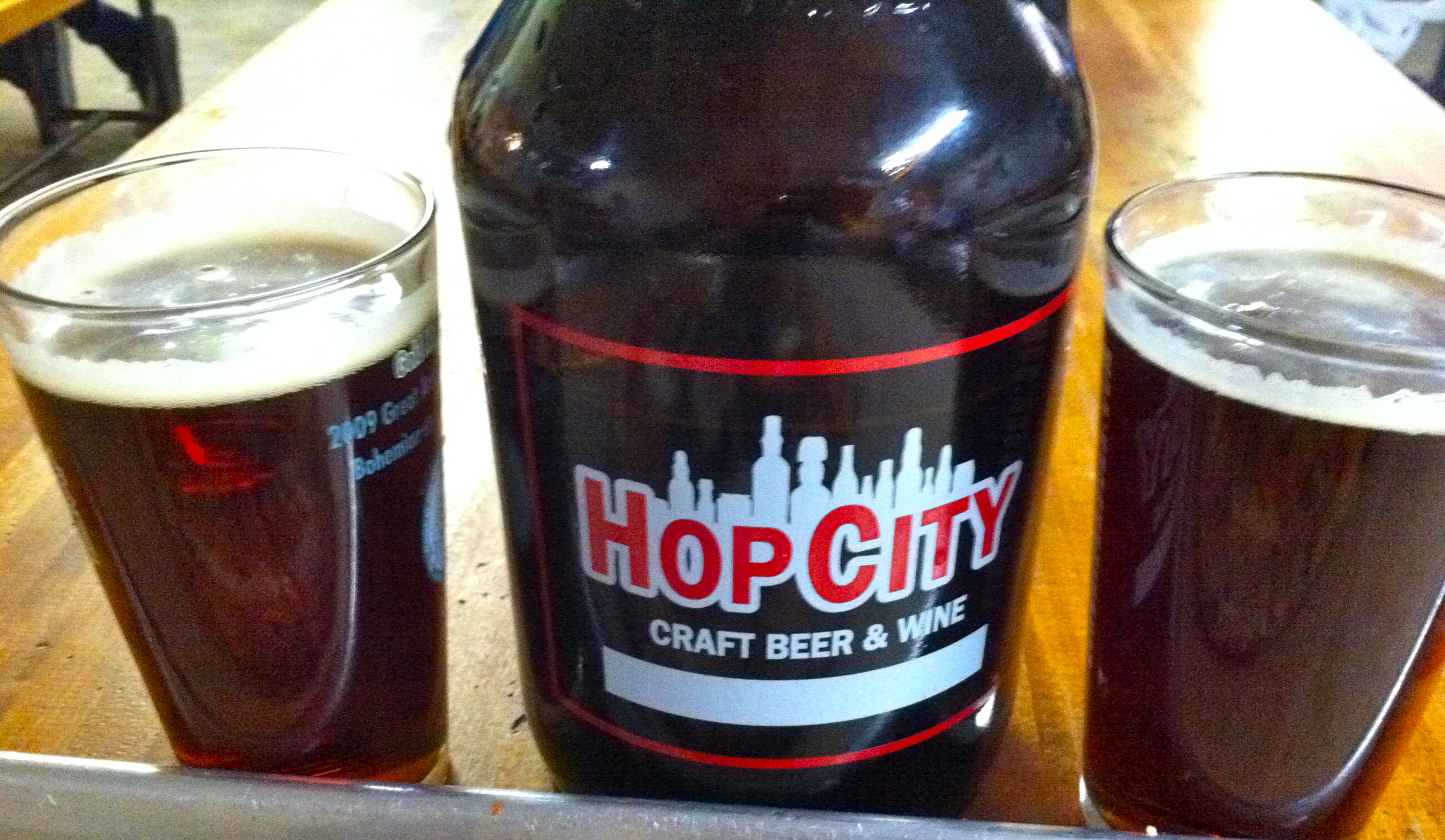 Hop City has just expanded their growler area to 60 taps, so the choices are endless. We are in a “brown” mood, so we select the Brooklyn Brown Ale and for $10, we have 64-ounces of fresh, cold beer to take into Antico.