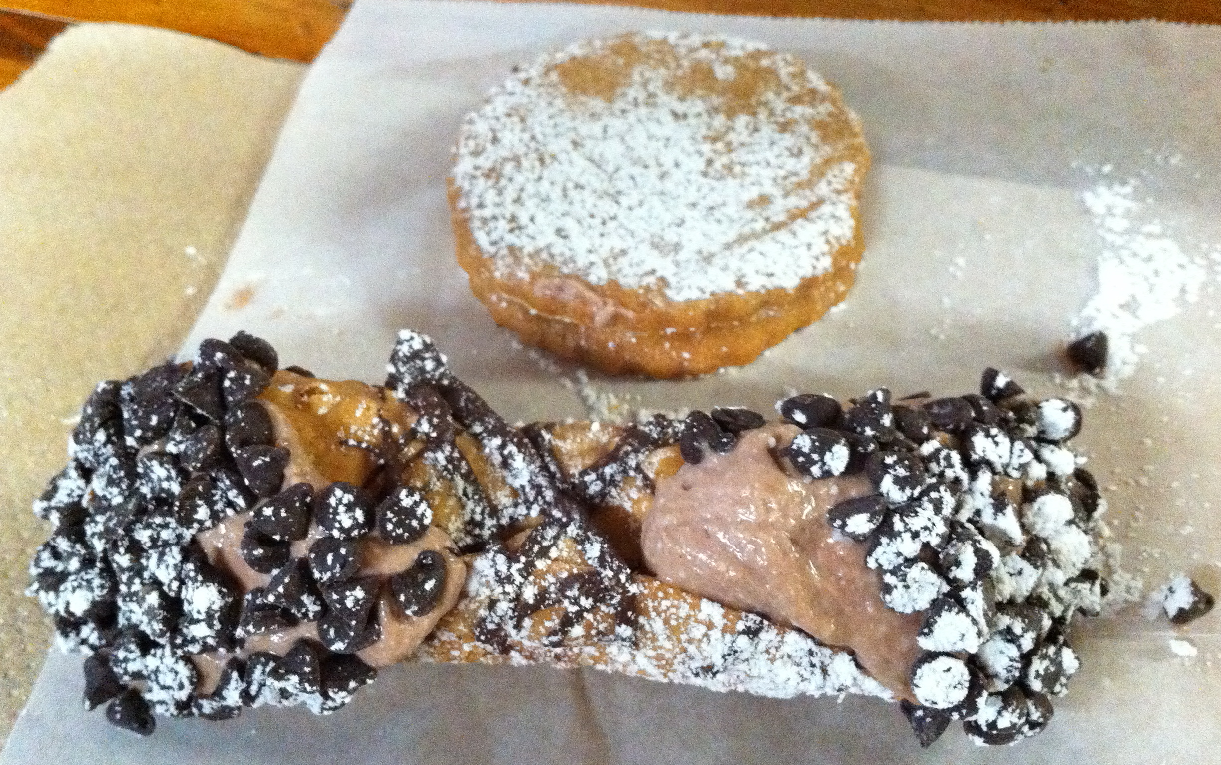 Eve picks the Tres Chocolato (3 chocolate), which is supposed to have chocolate filling with chocolate sprinkles and chocolate drizzled on top. Ours comes with chocolate chips instead, but it looks so good that we don’t really mind the substitution. We also get a small Italian cookie with Nutella inside.