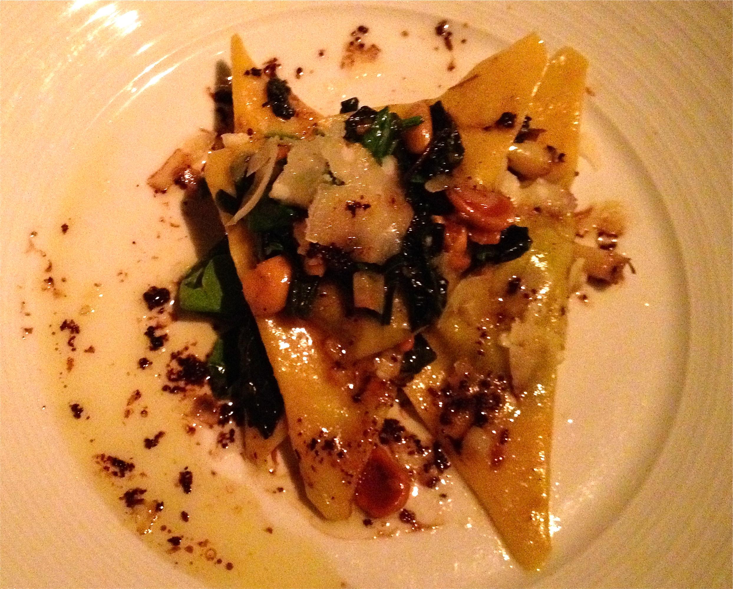 They are stuffed with fava beans and goat cheese and topped with nuts, kale, ramps and shaved parmesan cheese. There are only three ravioli triangles, but the thick pasta is perfectly al-dente and surprisingly filling. There is not a morsel left on my plate either.