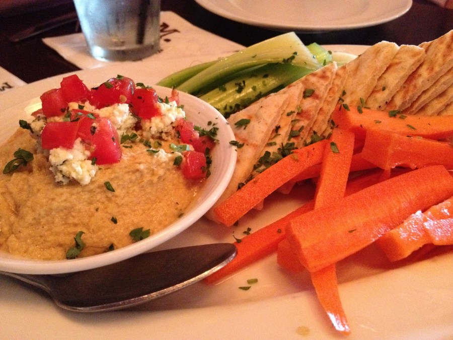 Our server Kim is ready to take our order, and since we haven’t had crushed chick peas for a couple of weeks, we go for the hummus appetizer.