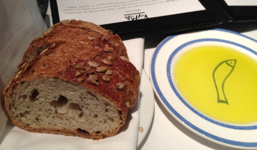 The lobsters are actually moving in the ice. We are shown to our table and some fresh-baked bread and olive oil appear very quickly.