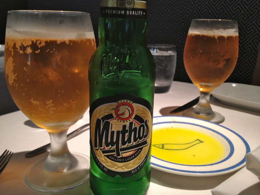 Getting into the Greek mood, we order a couple of Mythos beers.