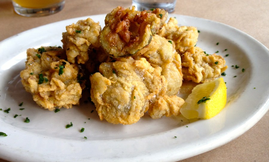 The pretzel is warm and salty and goes perfect with the beer. Most of the menu is made up of small plates, so the dishes are perfect for sharing. Next up is a plate of fried oysters.
