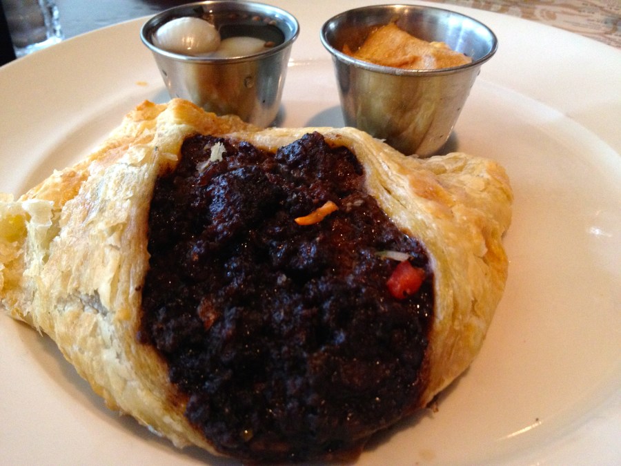 It’s time for some food, and we start things off with the English meat pie. It’s the same filling as shepherd’s pie, but they put it in a flaky pastry instead of over potatoes.