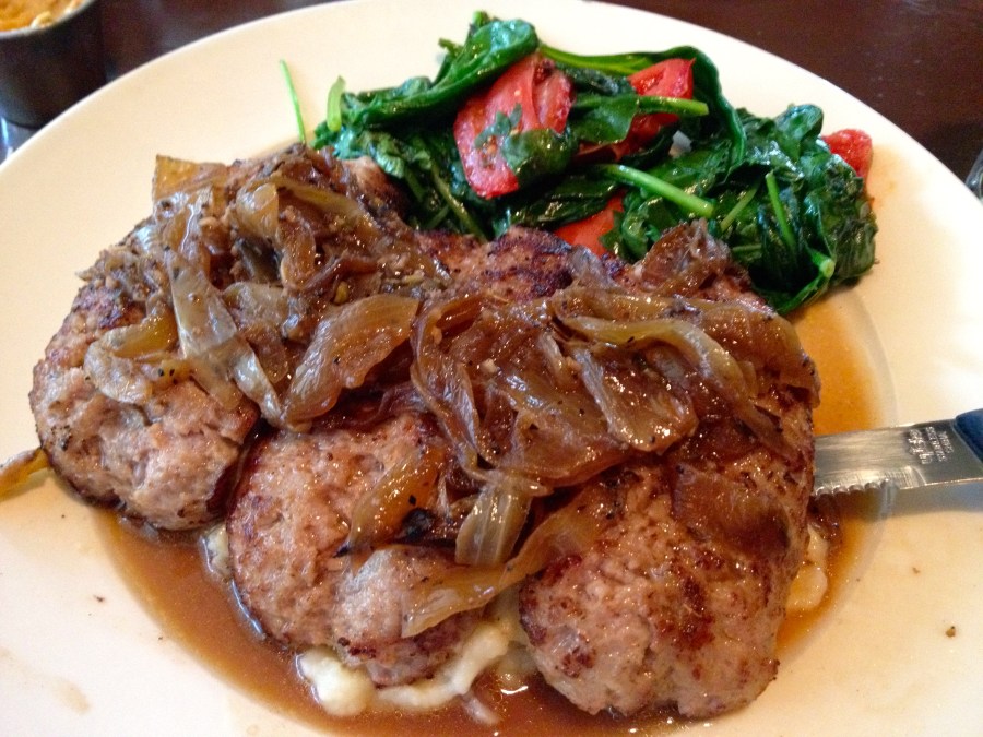 This is a very large order of food, and it’s good, but I decide the bangers are not completely cooked and I send it back to make them a little less pink. When the plate returns, it is full again, even though I have already eaten a lot of it.