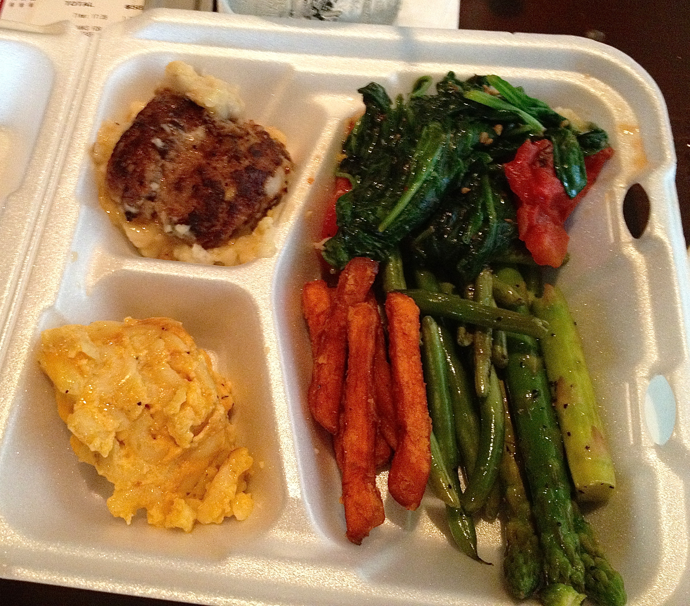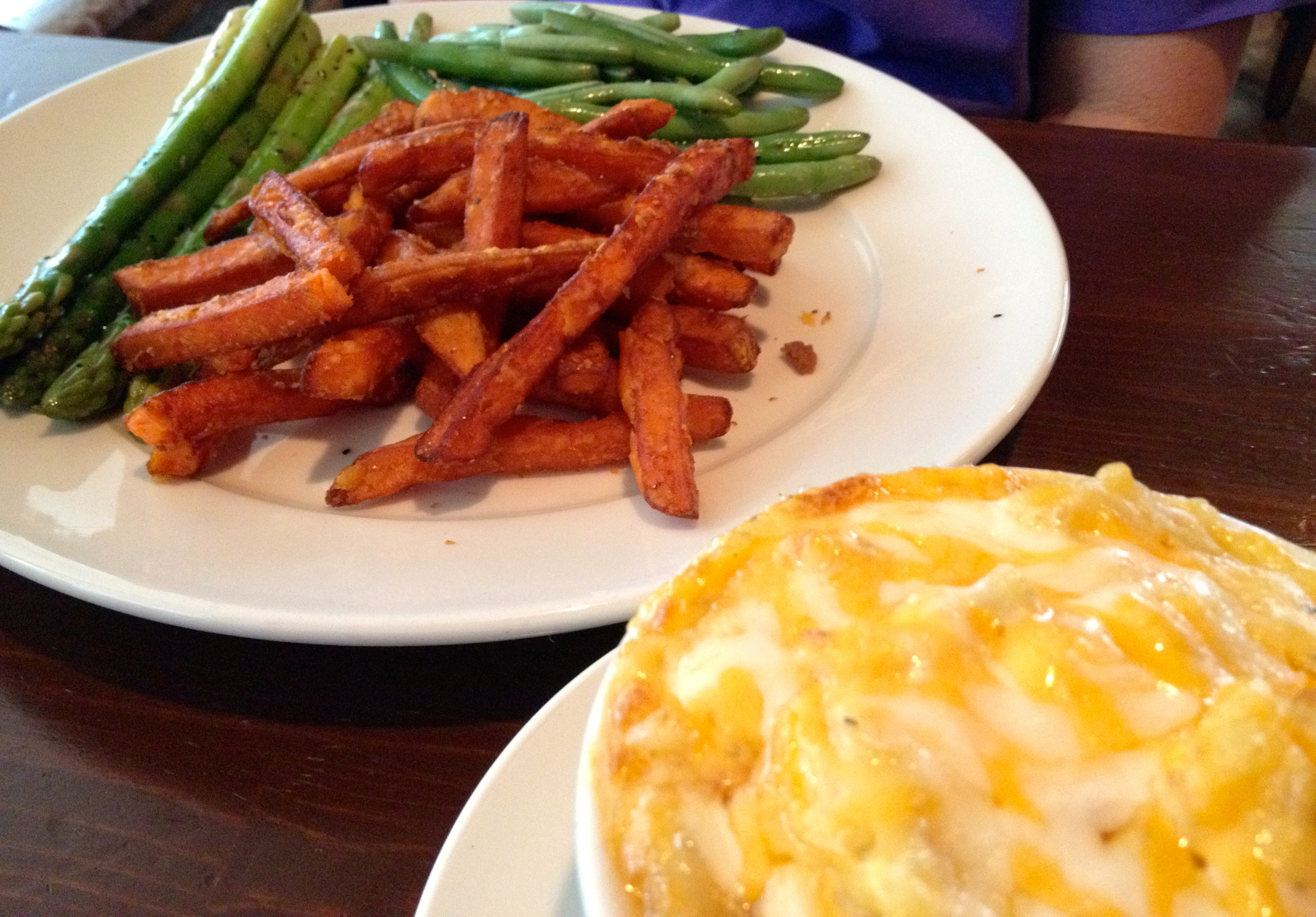 She picks well, choosing the three-cheese macaroni and cheese, asparagus, green beans, and fried sweet potatoes.