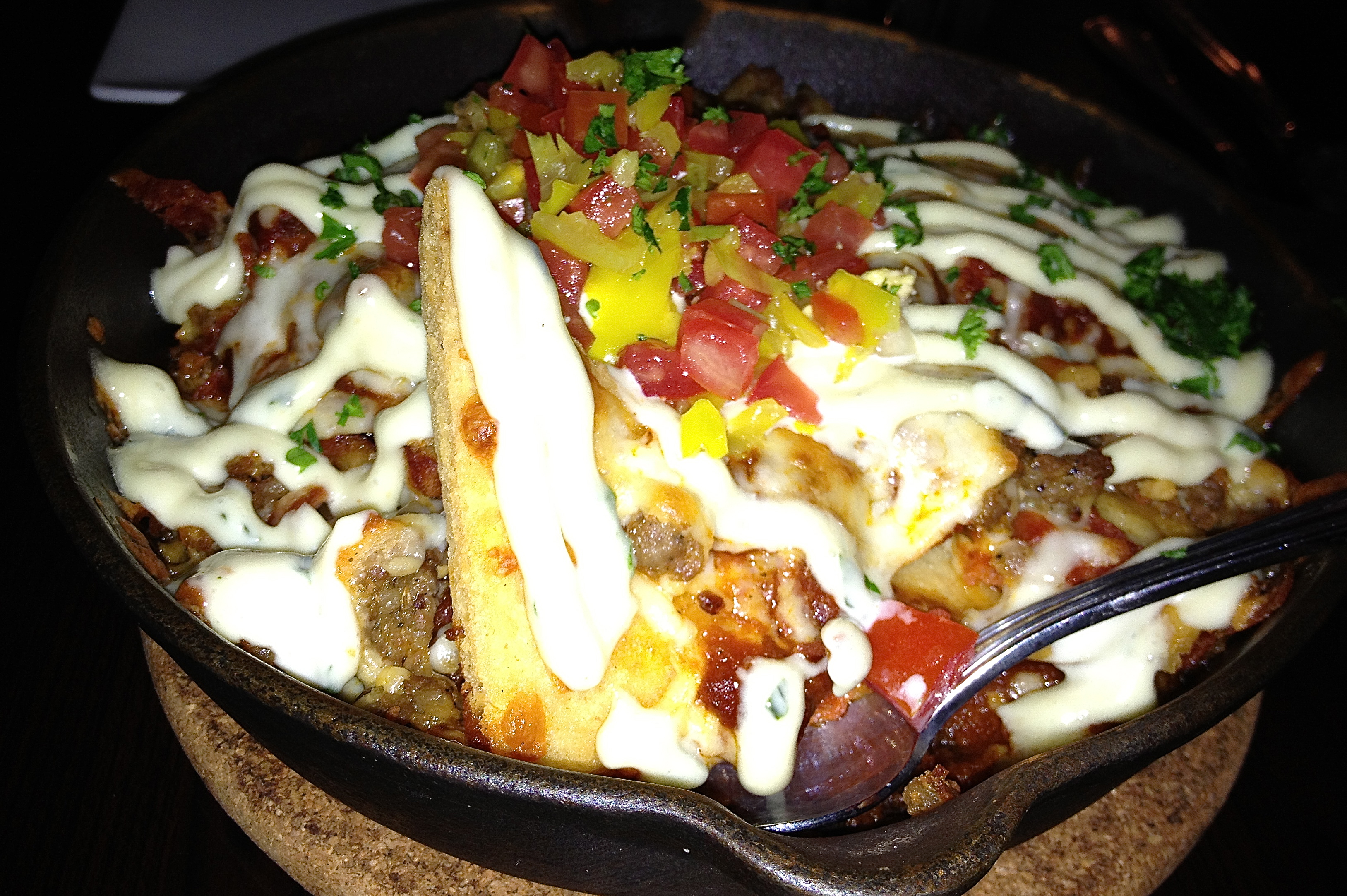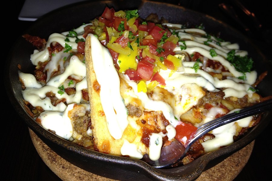 They take forever to arrive, because, as it is explained to us, the oven is not hot enough. Itachos are sausage, pepperoni, tomato sauce and cheese, served over pita points. Some of the points are crispy, others are soggy. It tastes really good, but would have been better if all of the pita was crisped.