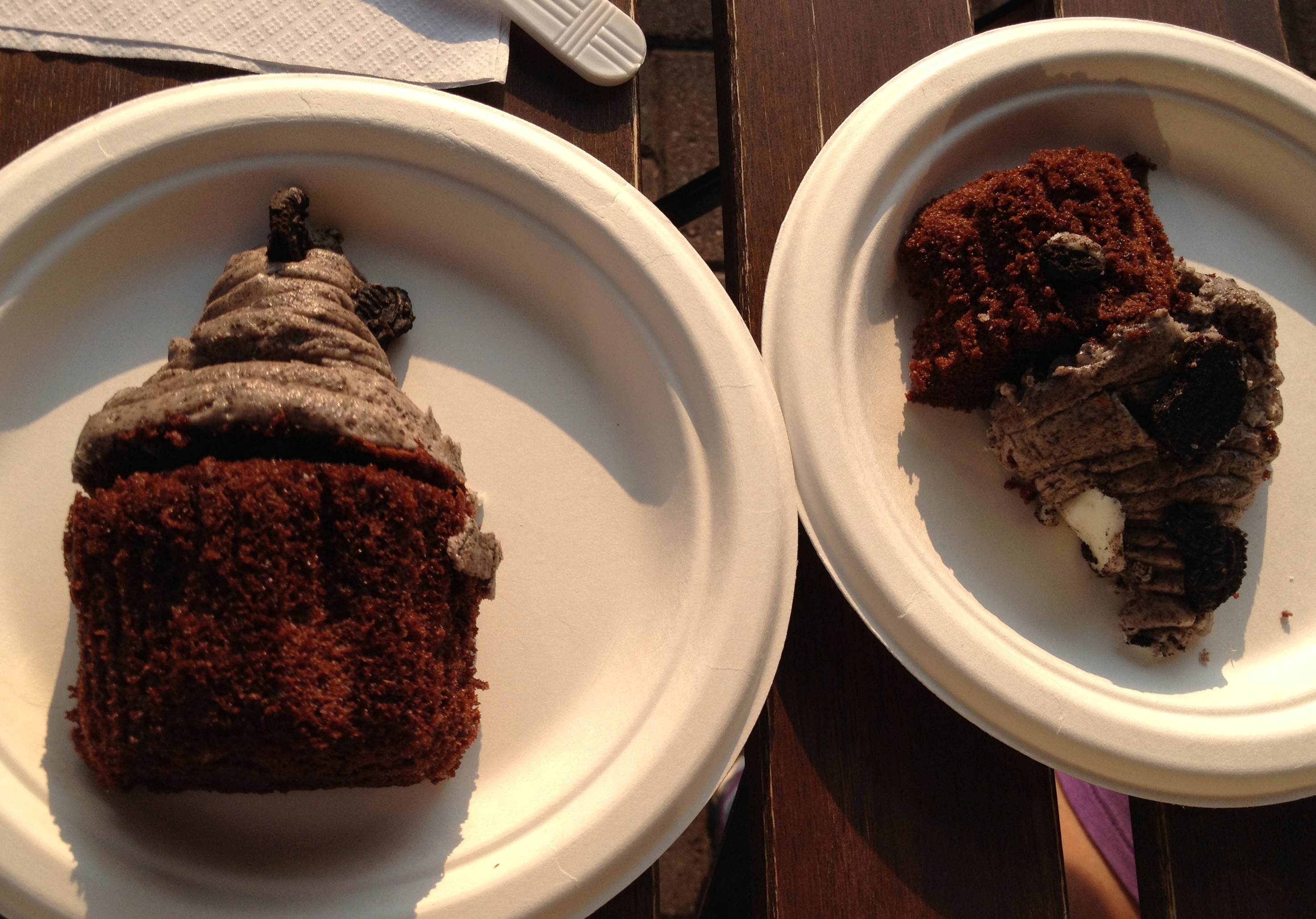 It’s really hard to pick one from the stack, but we finally choose the Oreo cupcake. They cut it in half for us (well, they screwed it up and made it about 67-33, and I got the bigger piece), and with it laid out on the plate like this, it was easy to have a bite of icing with each bite of cake. You can’t always do that if you are holding your cupcake.