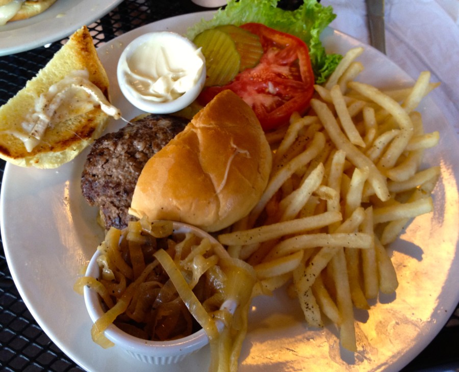 The burgers are served on a challah roll with lettuce, tomato and pickles and you pick french fries or coleslaw as your side. The server doesn’t ask how we want the burgers prepared, and we get the standard “medium-well”.