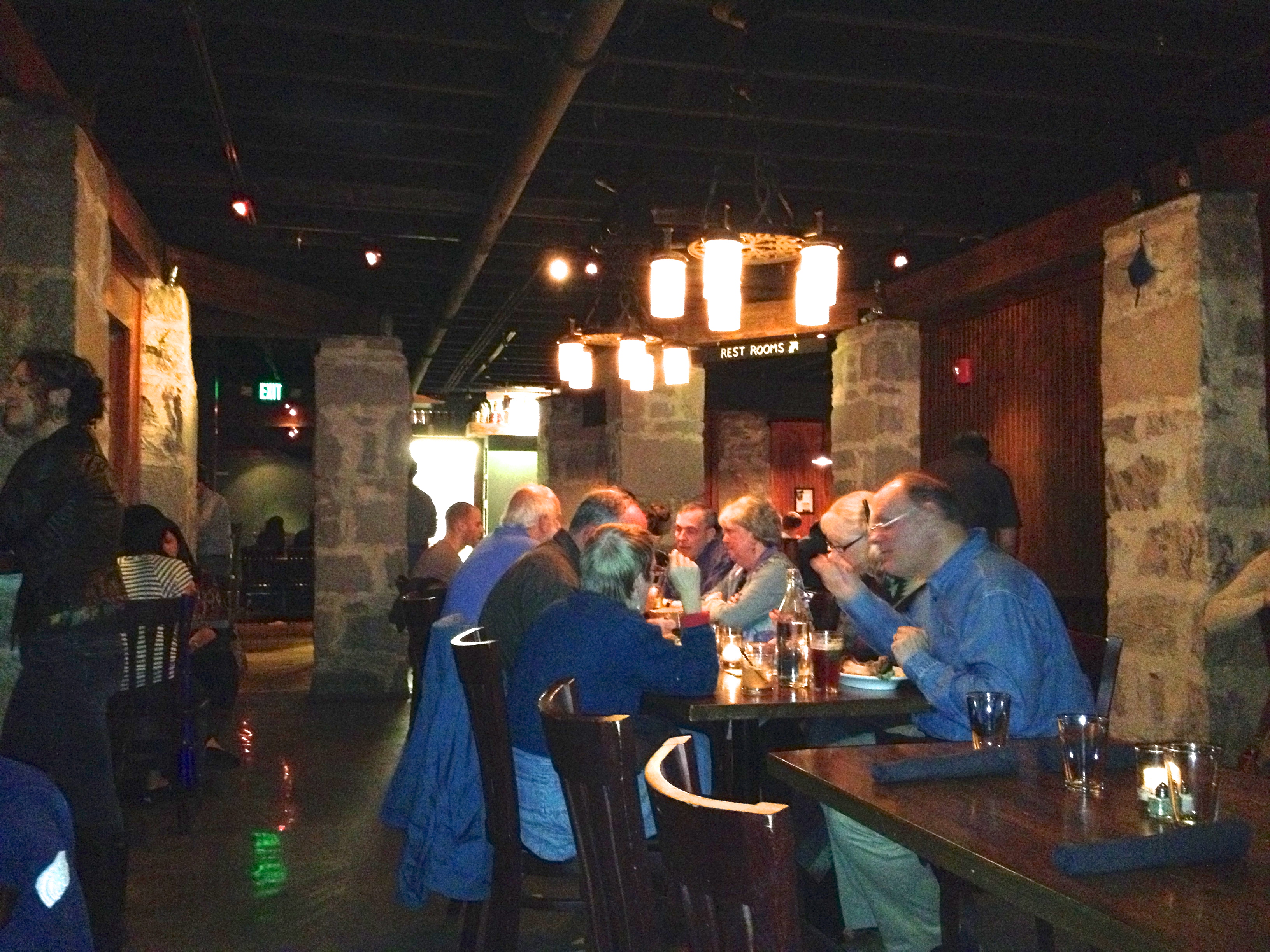 Eve orders a glass of scotch ale, which means we are actually trying seven beers tonight. Every spectrum is covered from a Kolsch, and English Mild, an IPA, an India Black Ale, and two kinds of stout. The scotch ale was a favorite, although the breakfast stout was very smooth. These beers are made in a warehouse behind the restaurant, and they vary their brews often. If we lived in the neighborhood we would be regulars here, stopping in every few weeks to see what new beers have appeared on the board.