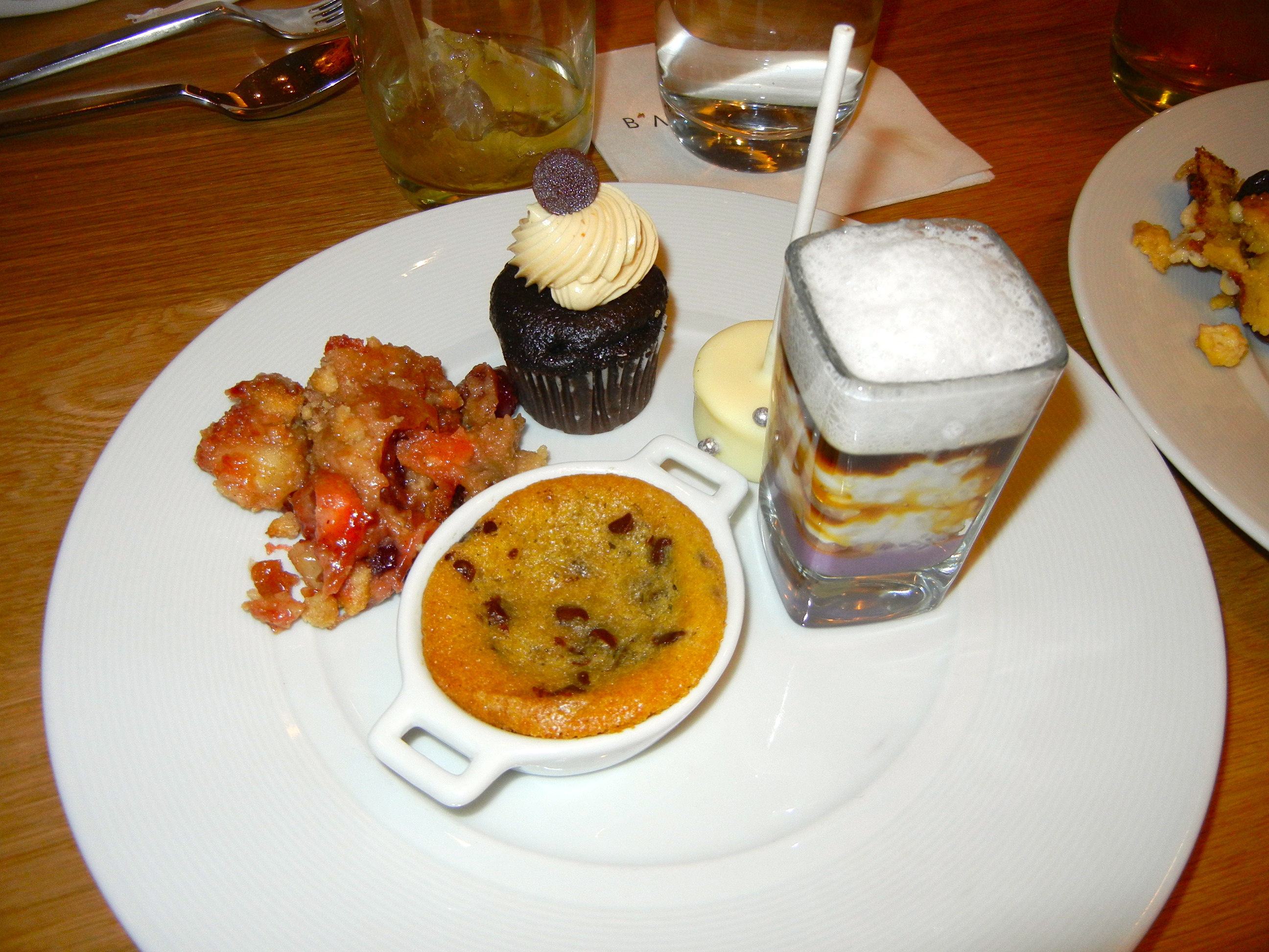 The giant meatball is good, as is the “pizza of the day”, which the chef, interacting with us in the interactive kitchen, proudly told us was his invention, artichokes and sun-dried tomato. Fortunately, I was able to split this with Eve, so that we would have room for dessert.