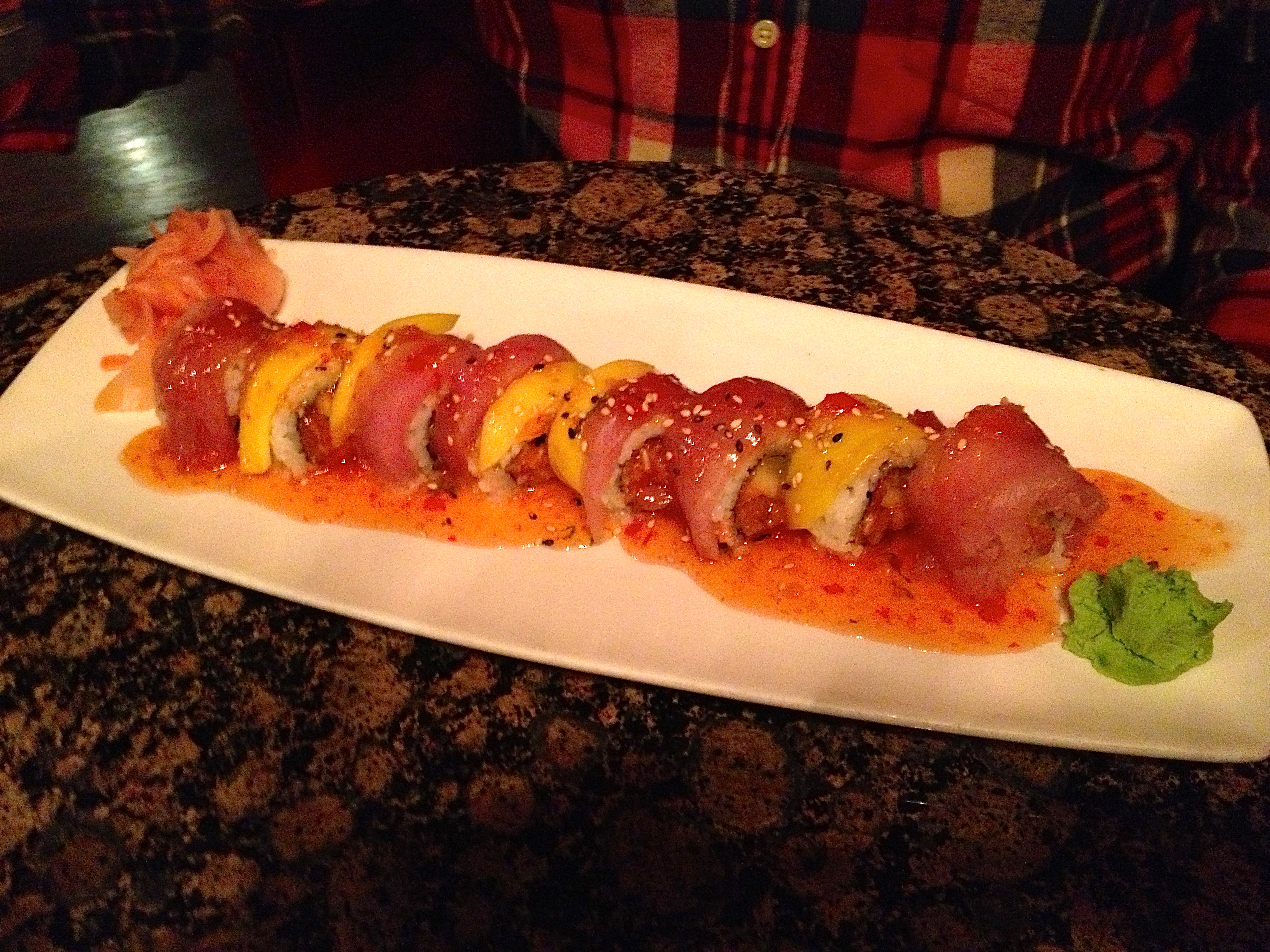 The Sinatra is a flash-fried roll of eel, yellowtail, tuna, cream cheese and asparagus. For $12, this is a “price performer” and a lot of food. It’s also very tasty. I am glad when Eve gives me back a piece of the roll after she eats her half because I do want more of it.