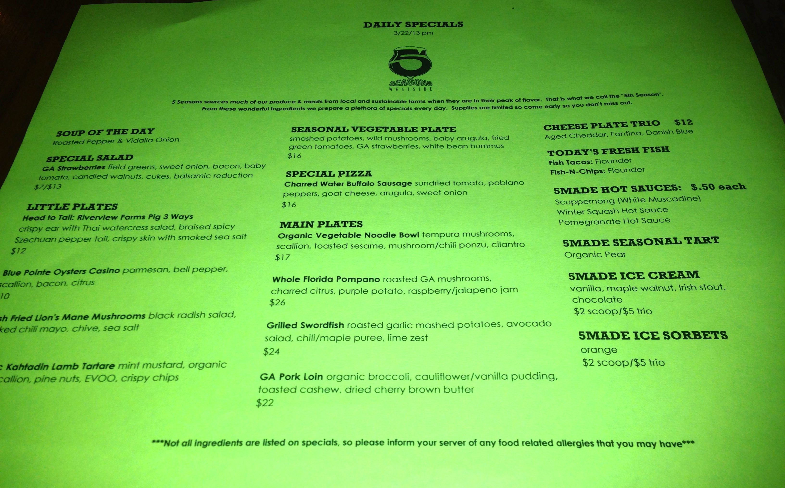 This is just the daily specials menu that our waiter Steven tells us changes twice a day. The regular menu is filled with small plates, salads and entrees. What to pick? Fortunately, we take our time with the pretzel and the beer until we can come up with a strategy. We decide to go with something smaller.