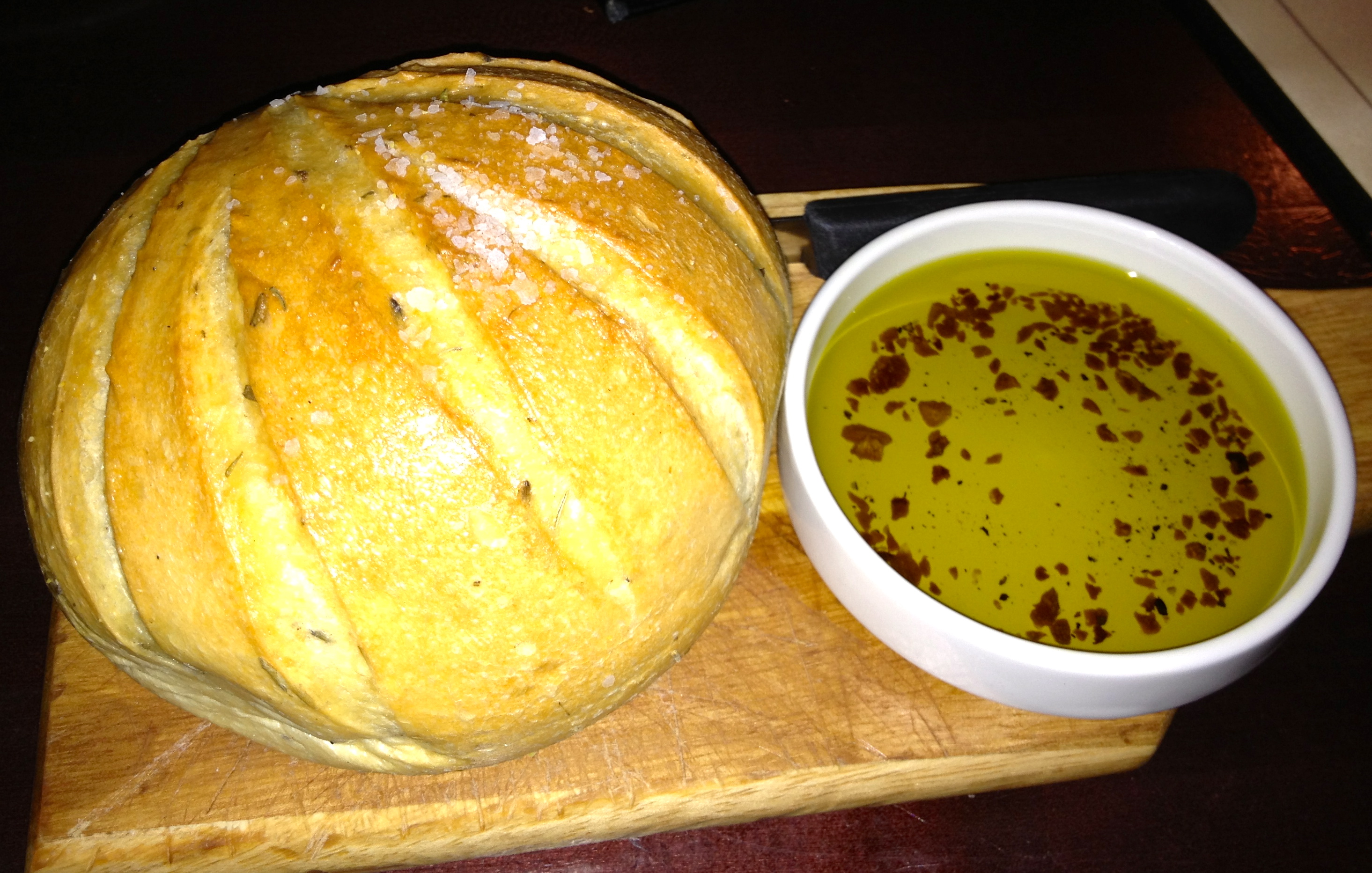 We are shown to table 53, which is not a booth, but affords me a nice view of the proceedings. Eve has to settle for a view of me, although I think she can see outside into Alpine’s patio area. We are greeted with waters and a loaf of warm Italian bread with rosemary.