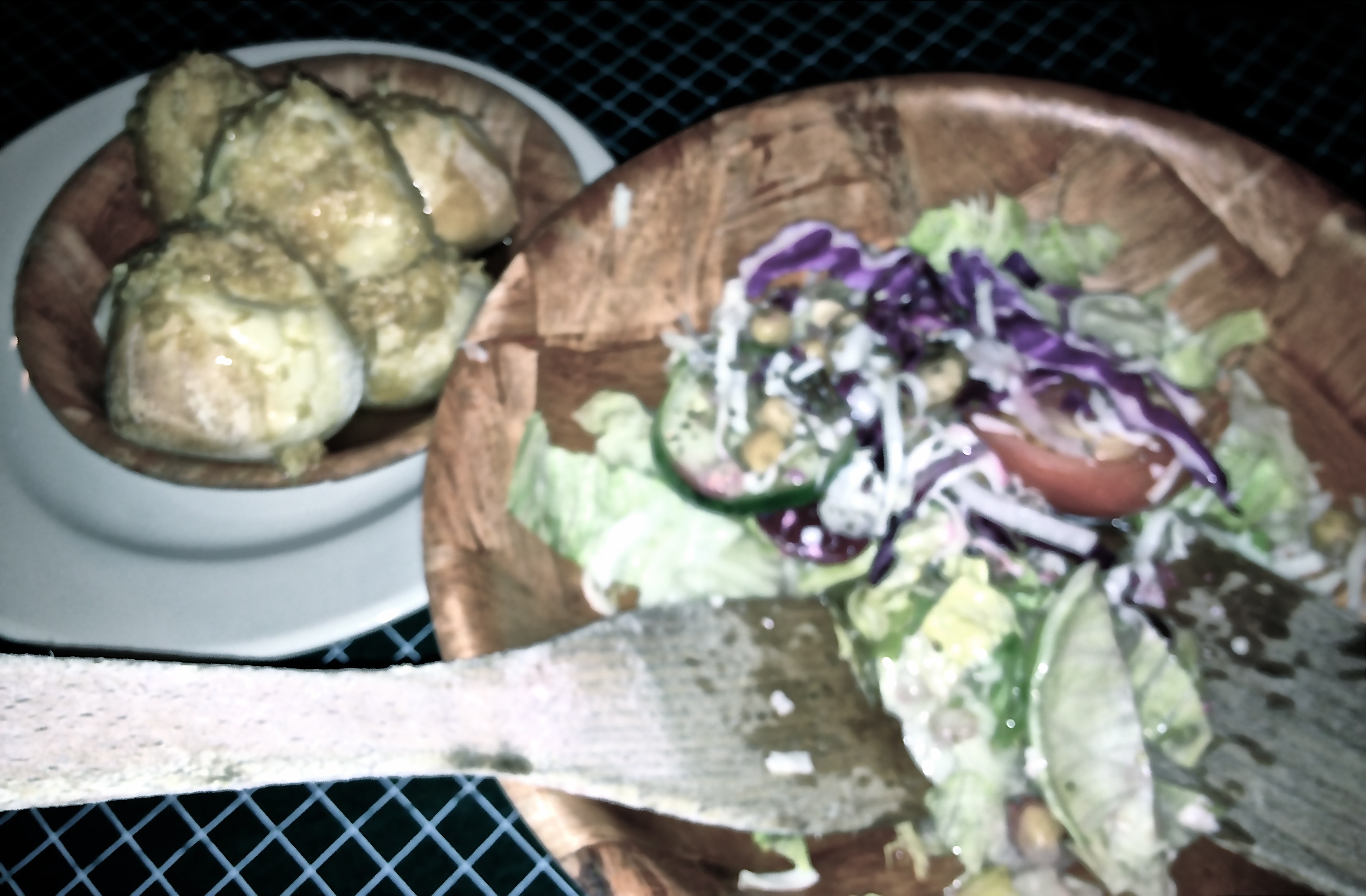 Our waiter, Nathan, who does a good job tonight, returns a few minutes later with our salad and our garlic rolls and informs us that the kitchen has burned our first order of mushrooms and the next one will be out in a few minutes. The mushrooms are delivered and these are severely undercooked. The sausage stuffing is lukewarm and the mushrooms are more or less raw. At least the butter-garlic sauce they are floating in is hot. Date Night is not afraid to send things back and we return these for further cooking.