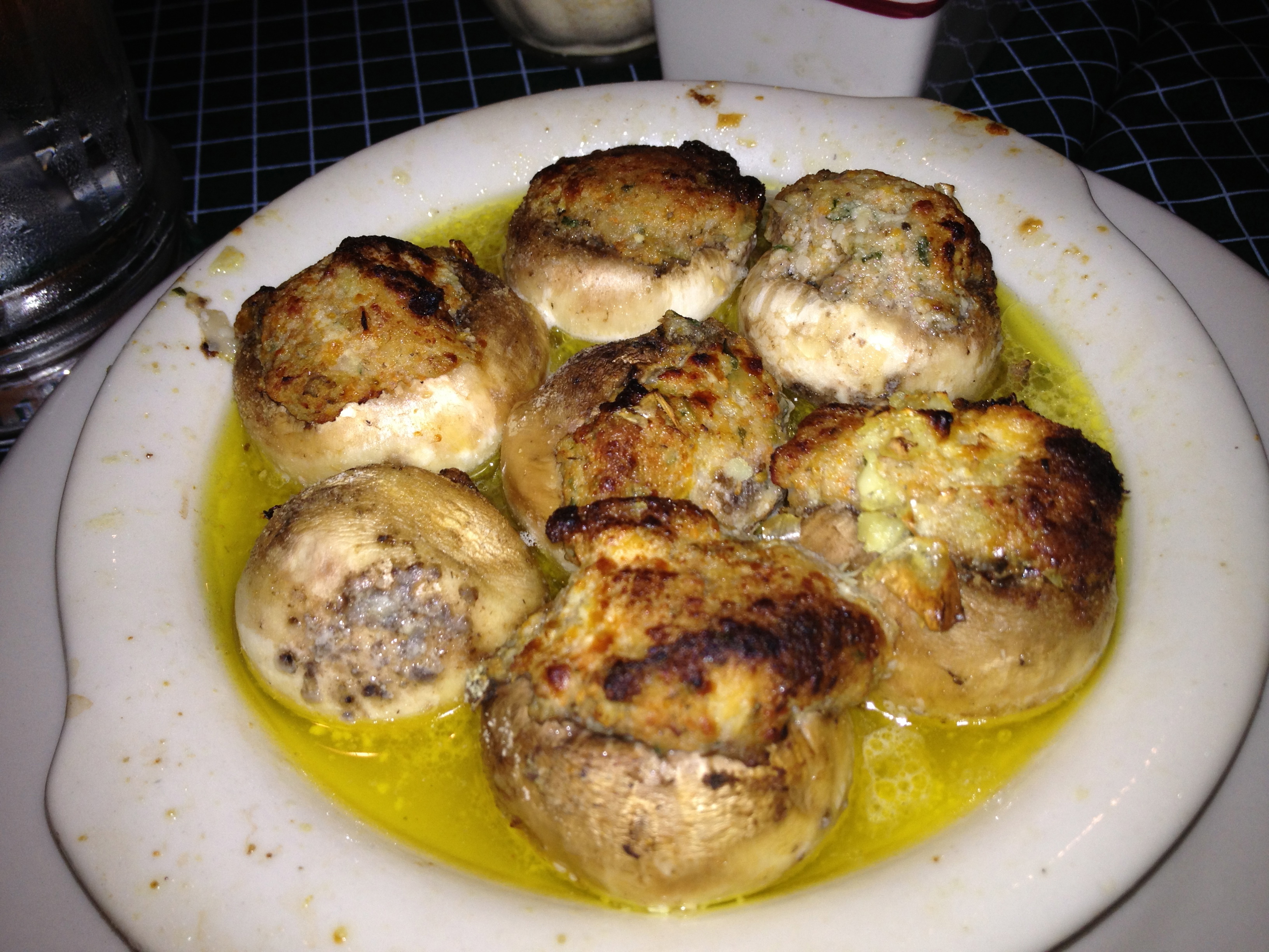 We skip our customary beers and go right for two glasses of Chianti. They don’t even have beer on the menu, but there are people drinking it at the bar, so we know it’s available. Just about everything on the appetizer menu is fried, which we are avoiding tonight. We order one of the few appetizers that are not fried, the stuffed mushrooms, which turn into “fungal frustration”.
