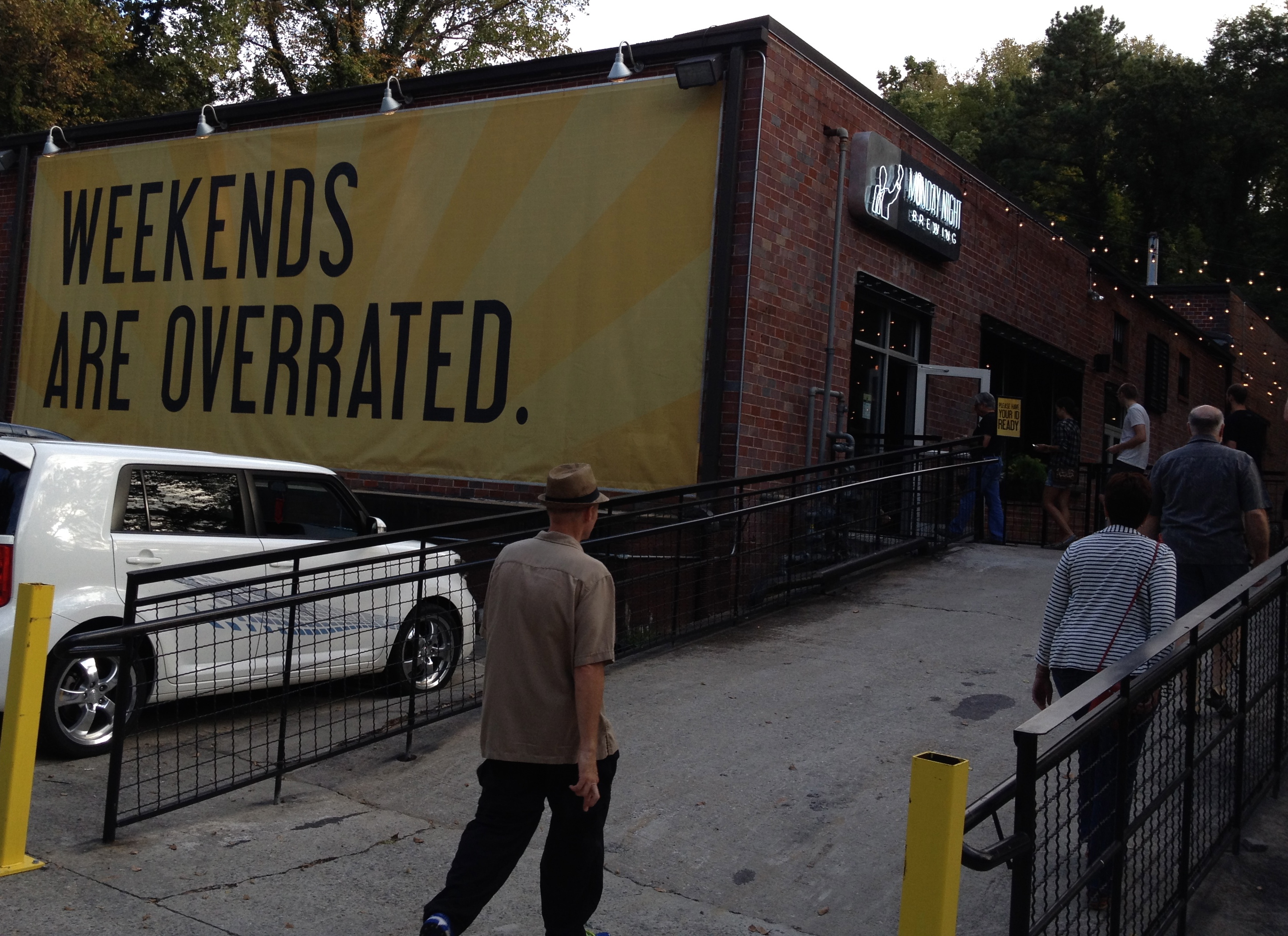 Monday Night opened their tasting area in January, and it’s a good one. It’s nice and big and can handle a lot of people. We are meeting a group of friends and get one of the long outdoor tables in the Monday Night beer garden. For $10, you get a glass and six “tastes” of beer.
