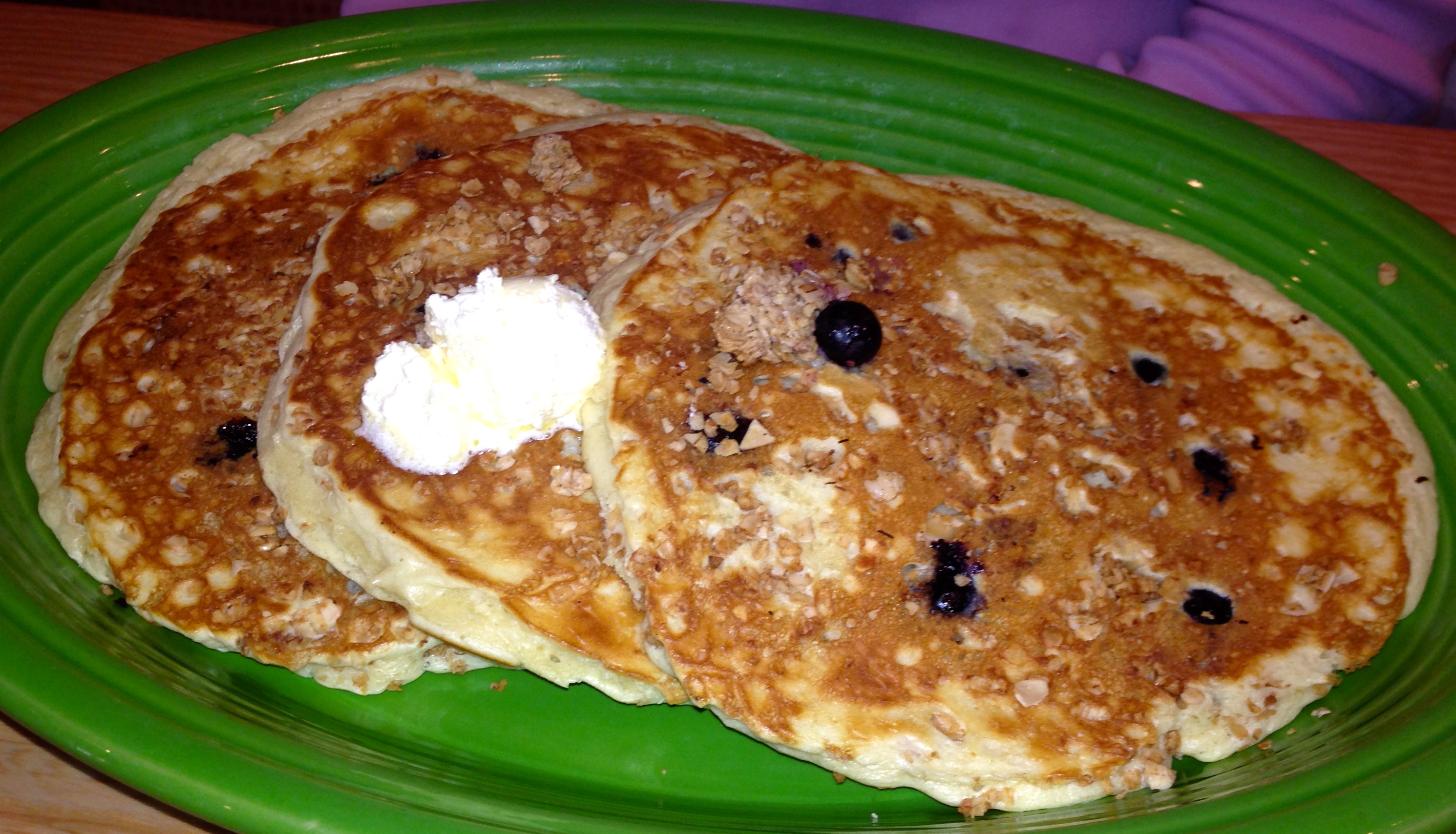 We order two of the J. Christopher’s “standards”. First up, the Blueberry Crunch Cakes, with blueberries and granola inside.