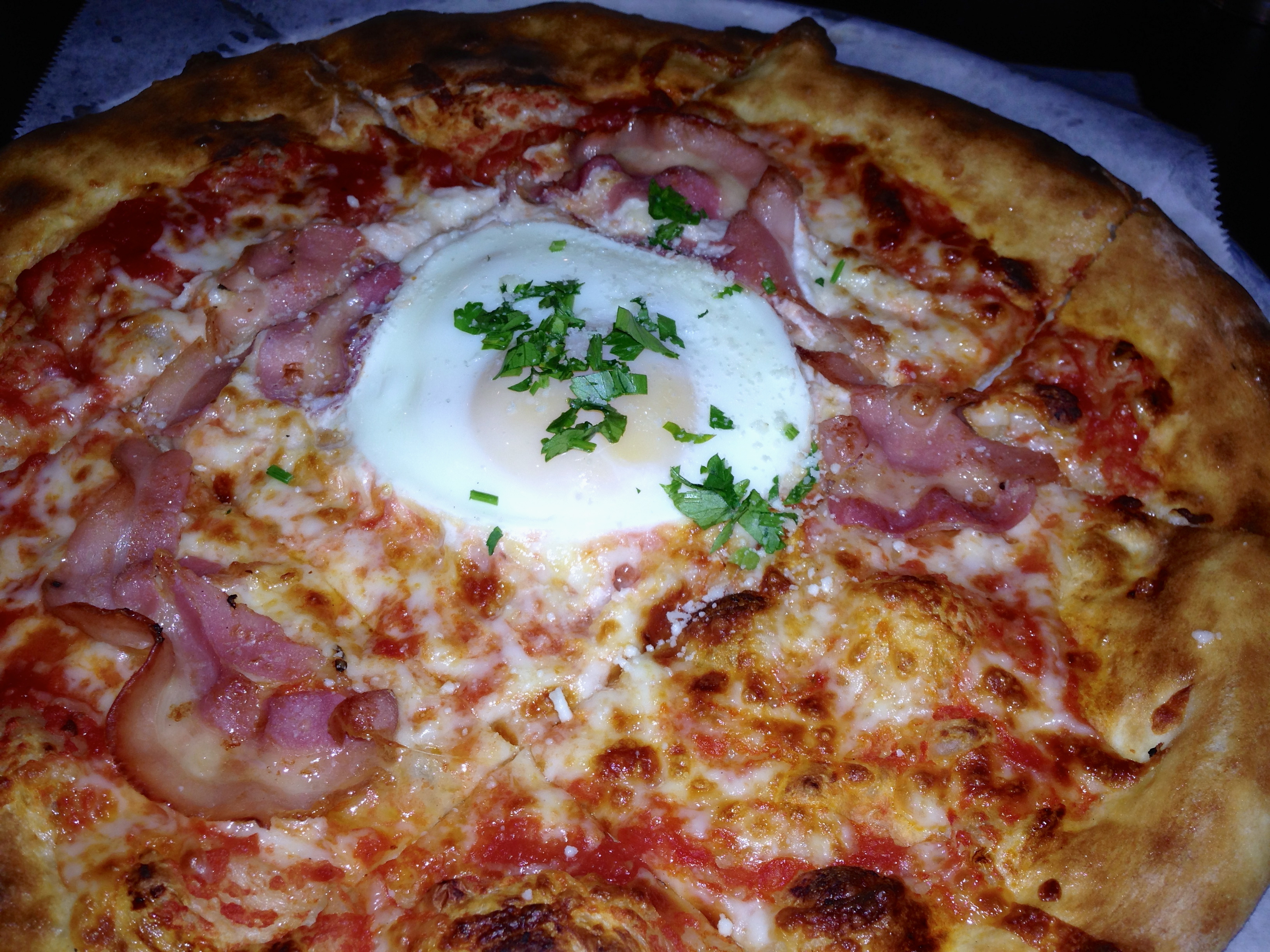 Yes, there is an egg in the middle of the pizza. The “bacon” is pancetta, which adds a lot of saltiness to the pizza. I break the yolk and make a yummy, gooey mess in the middle of my pie. Eve goes for the daily special.