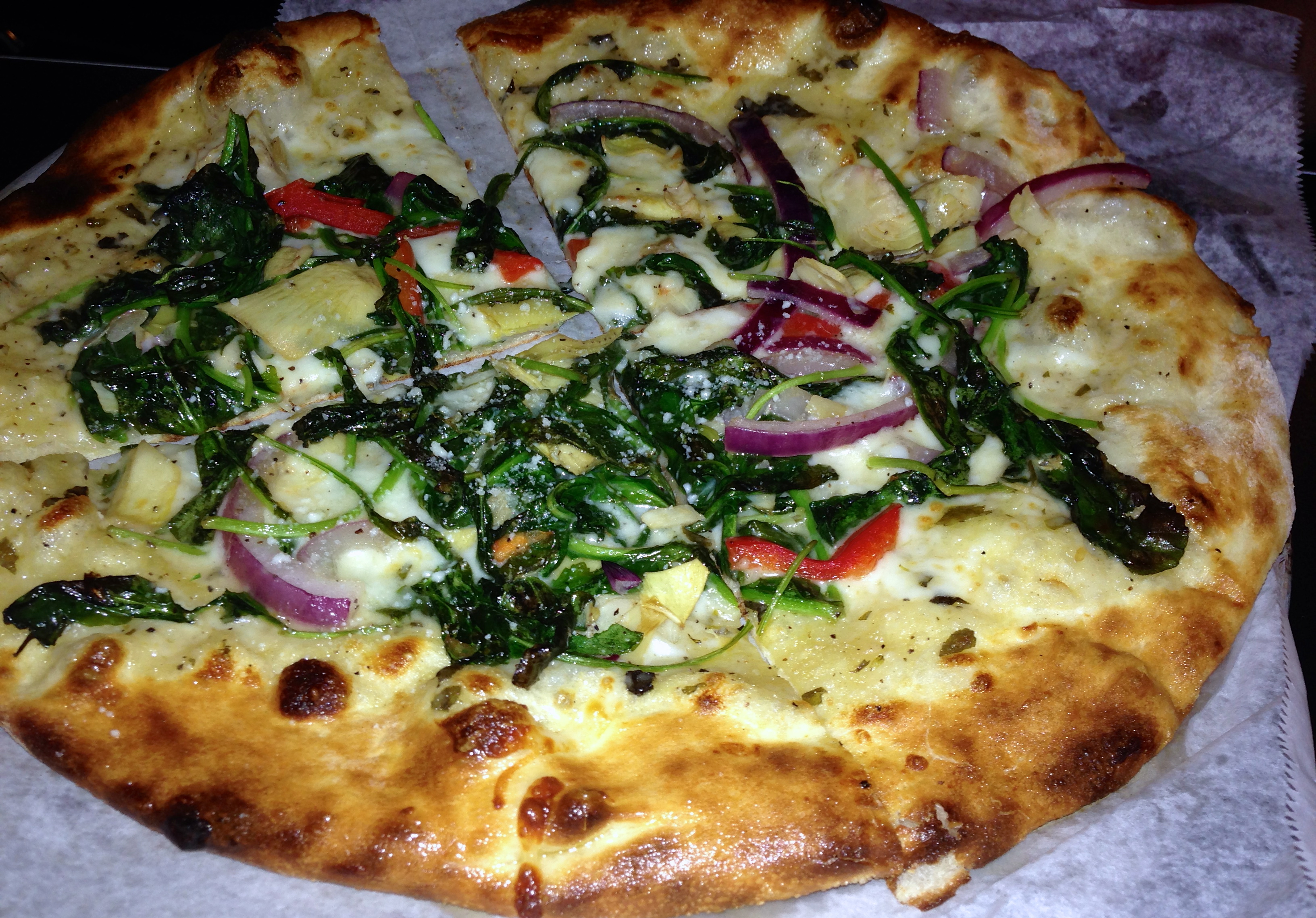If you “go ask Alice”, (extra points if you get the Jefferson Airplane reference), she will tell you that a béchamel sauce tops the pizza as do arugula, artichokes, onions and peppers. With all of those onions and peppers, don’t eat this pizza if you are on a date!