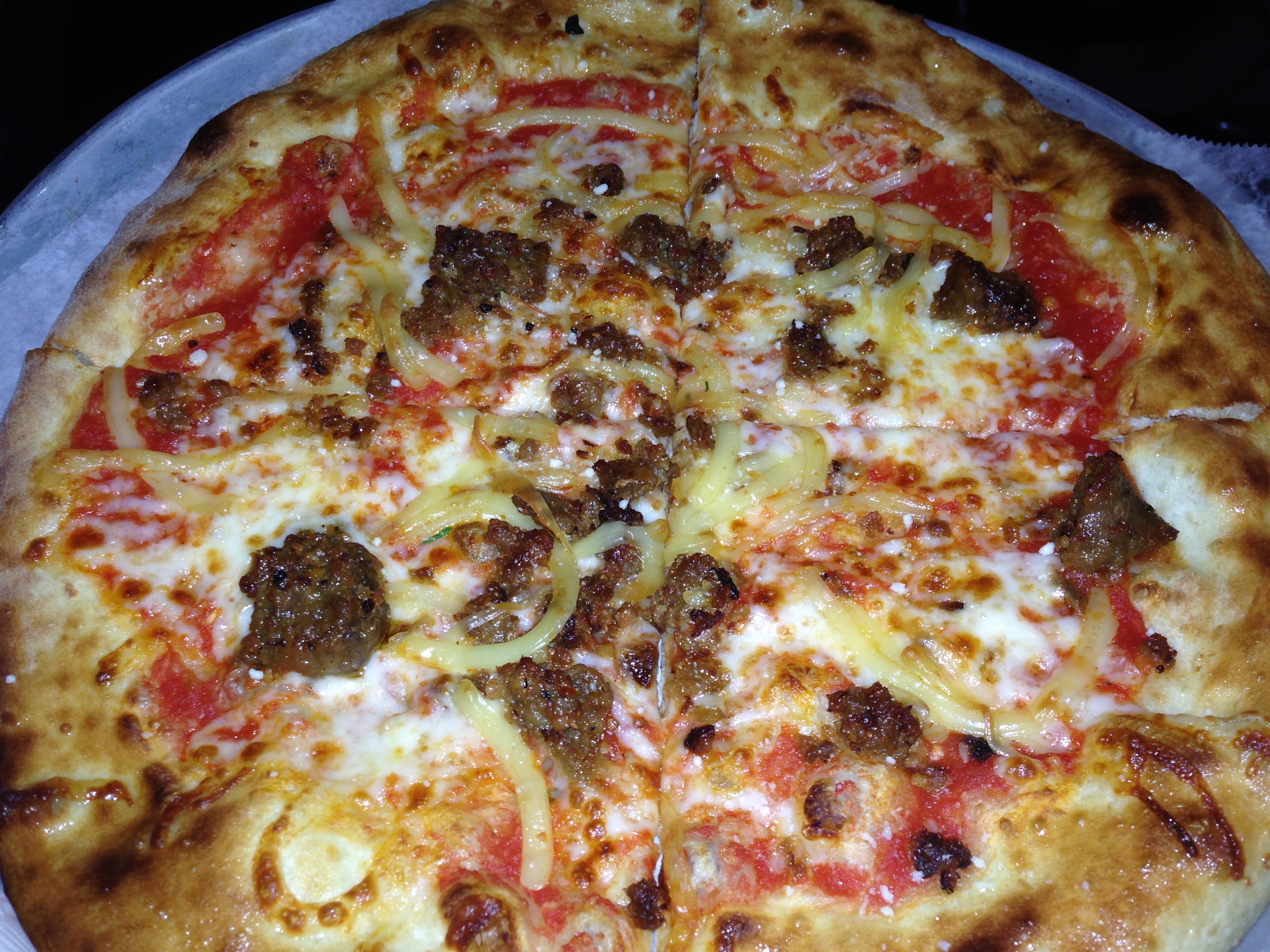 Spicy sausage and gouda cheese top this pizza. It is supposed to have jalapeño peppers on it as well, but she wisely omits those as the pizza is spicy enough without them. Elliott orders the White Rabbit pizza.