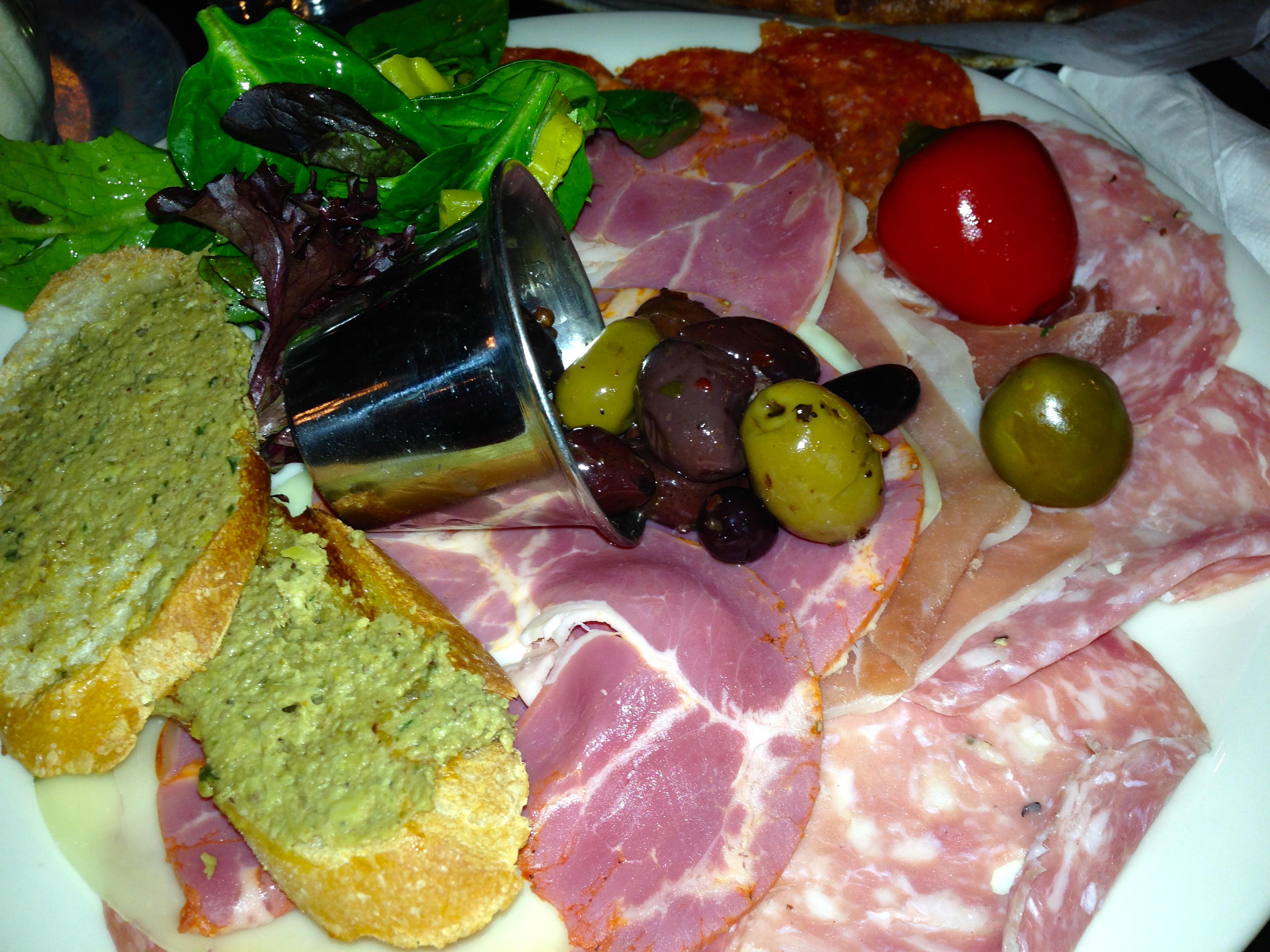 Ted’s features stone-baked pizzas in a large oven. You can get sandwiches as well, but we have to try that oven. And that means pizza for the three of us. But first, take a look at the antipasto plate.