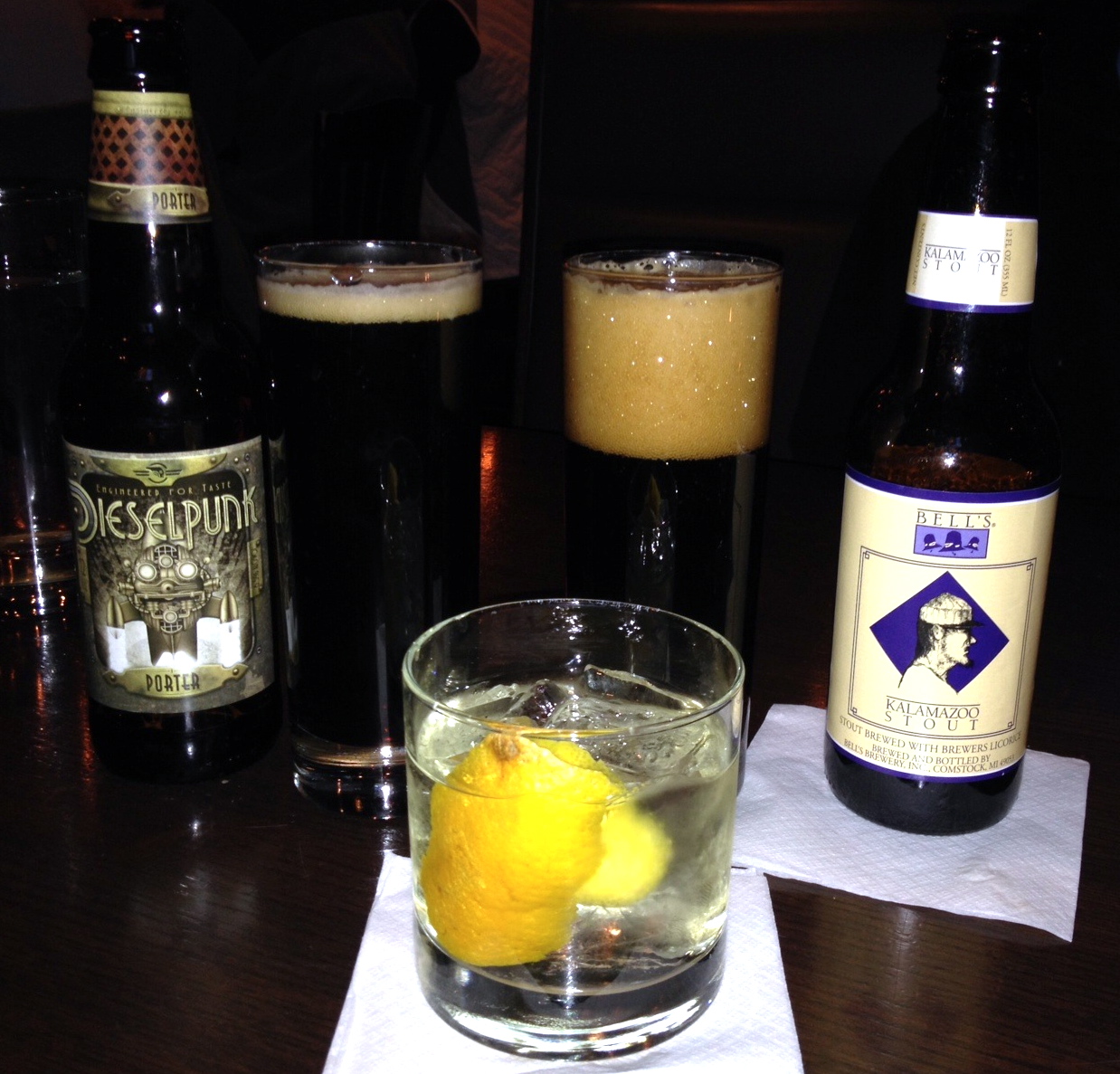 We are joined tonight by our son Elliott, home from college for the holiday break, which is why you see three glasses here. Elliott wants to try the moonshine and orders and Old Fashioned made with moonshine and orange bitters. You can get many versions of moonshine here. They infuse it with wood or with fruit. Not wanting a headache in the morning, we stick with beer tonight. From the list of ten craft beers, we choose a Dieselpunk Porter and a Bell’s Kalamazoo Stout. The porter has a lot of caramel malts, but hits you with coffee when you first taste it. The stout has coffee flavoring as well.