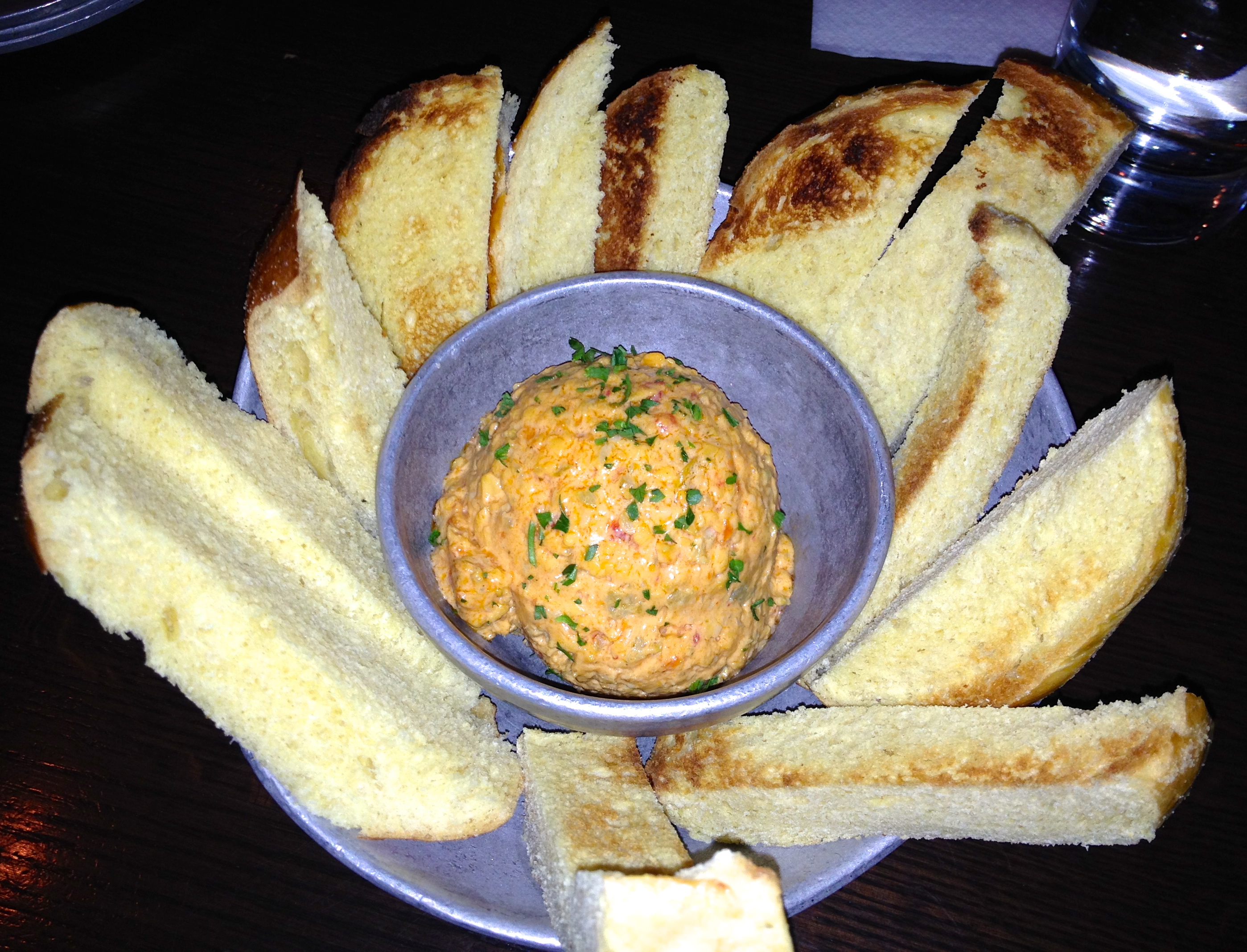 We choose the pimiento cheese, which has a bit of a kick to it. It comes with toast and is a nice compliment to our drinks.