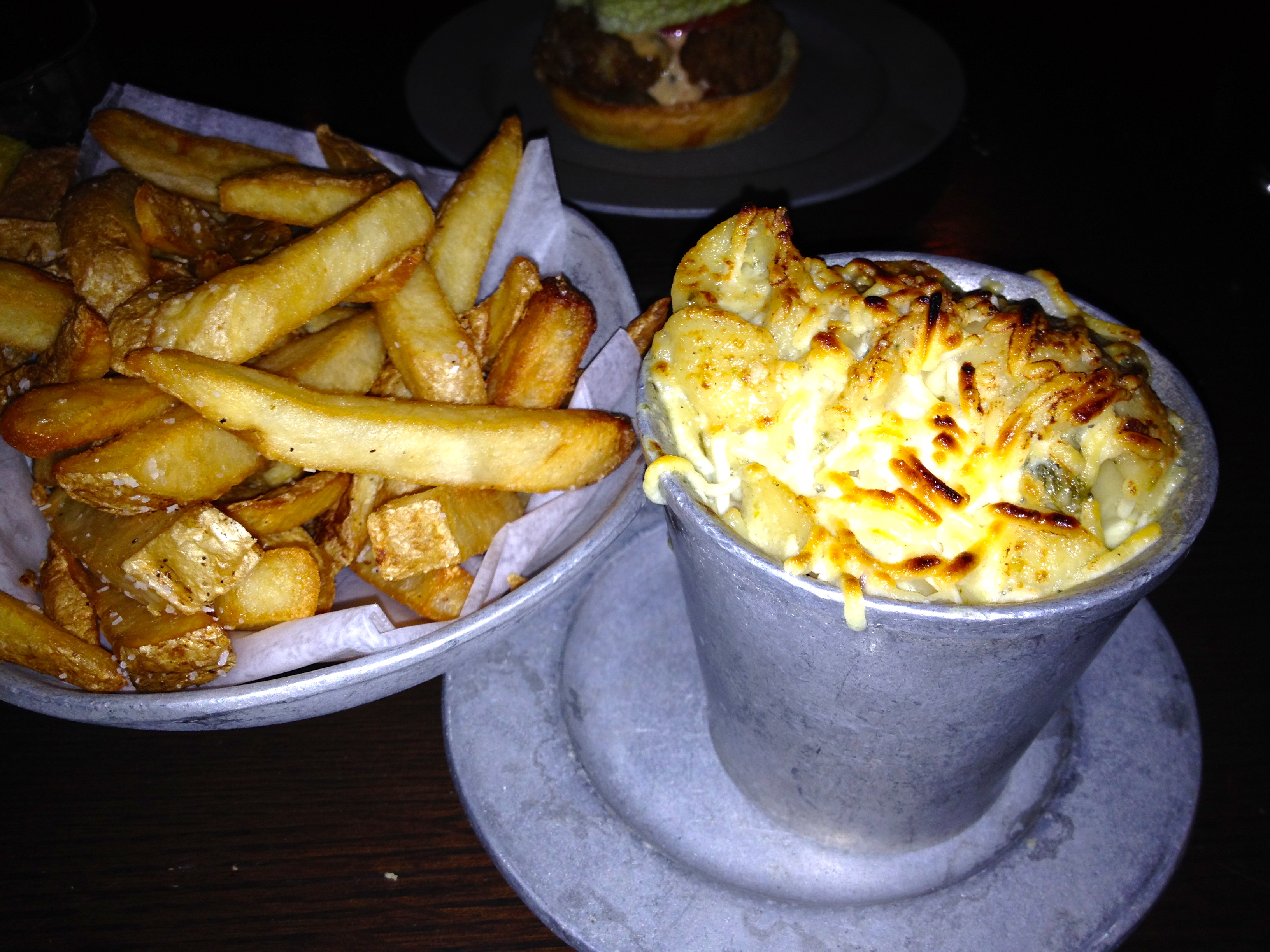 We get our fries straight, although we could have ordered them with either cheese or gravy. Sides range from greens to cole slaw to cream corn. We get the Spicy Macaroni and Cheese. There are poblano peppers in the mac and cheese, but surprisingly, the pimiento cheese is spicier tonight.