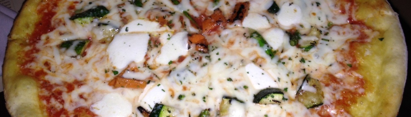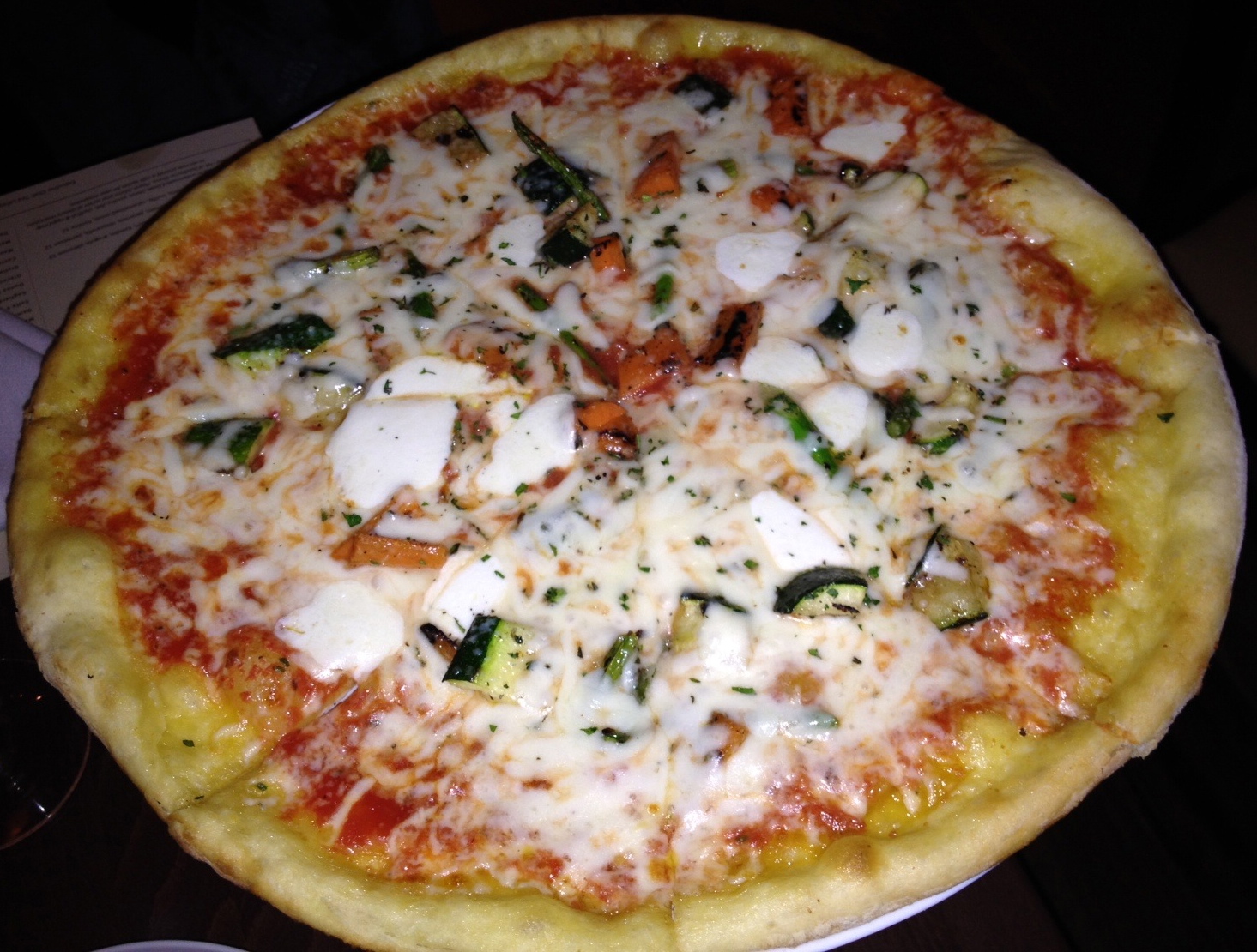 Next, we select a vegetable pizza, this one with fresh zucchini, carrots and asparagus. Our vegetarian readers will love this pizza. We do too. It’s way too big for us to finish, and we get it boxed up to take home, knowing that it won’t last long when our college-aged son gets ahold of it.
