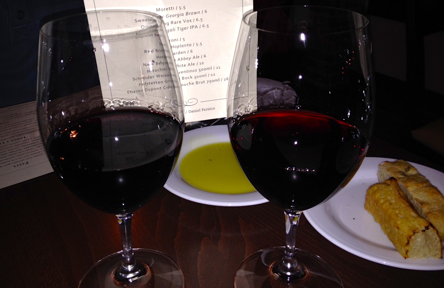 I order a Tuscan red and Eve gets a Chianti. These are either big glasses or small pours. A small quibble–we think there should have been more wine, especially at $12 a glass. Maybe that’s why we are beer people.
