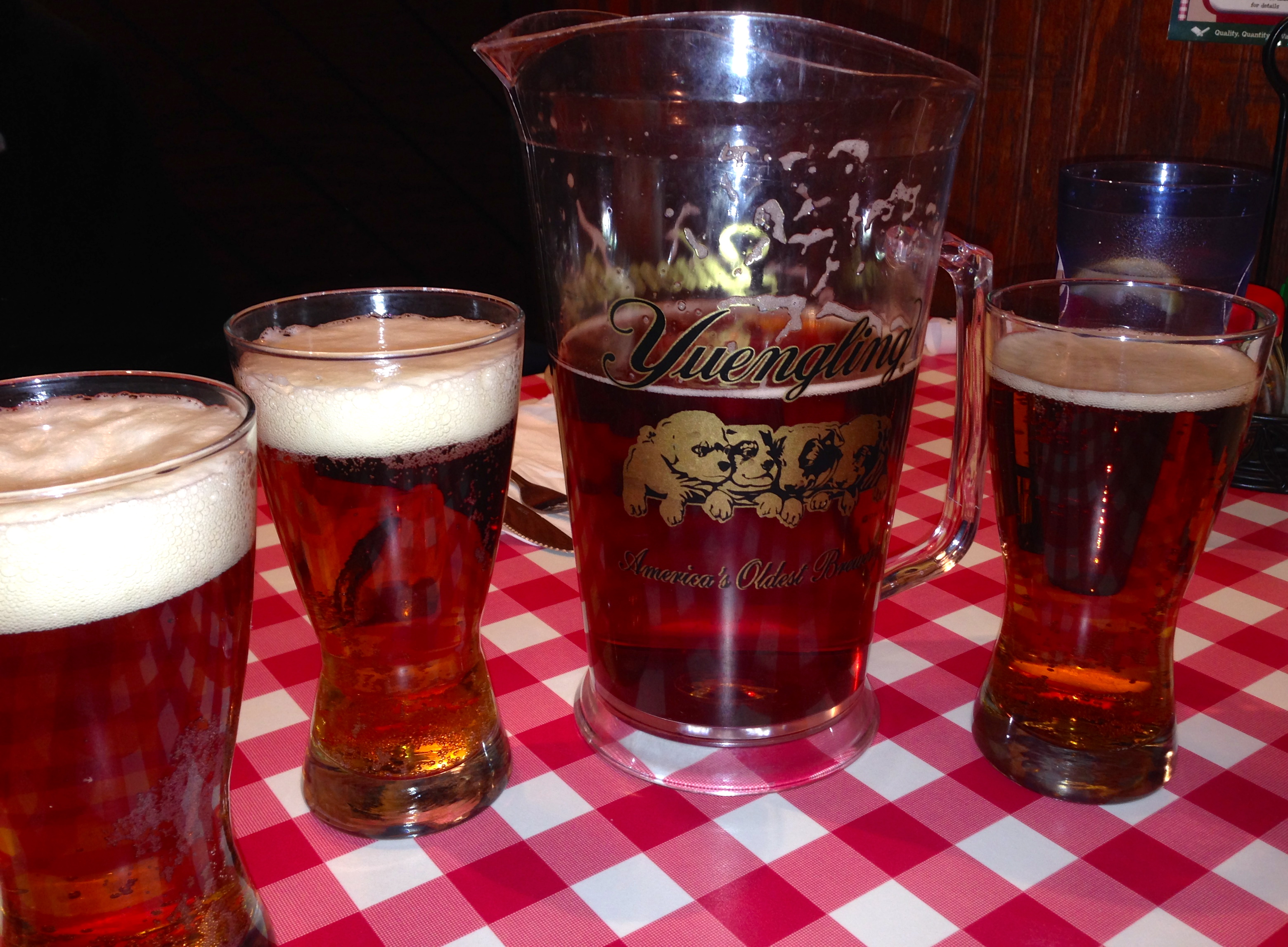 Yuengling amber is the only beer on tap. The most exotic beer on their list is Red Hare lager in cans. Otherwise, there’s just “convenience store beer”. The Yuengling has a hint of malty flavor, and it’s inexpensive. We get six glasses of beer out of the pitcher for under $14.