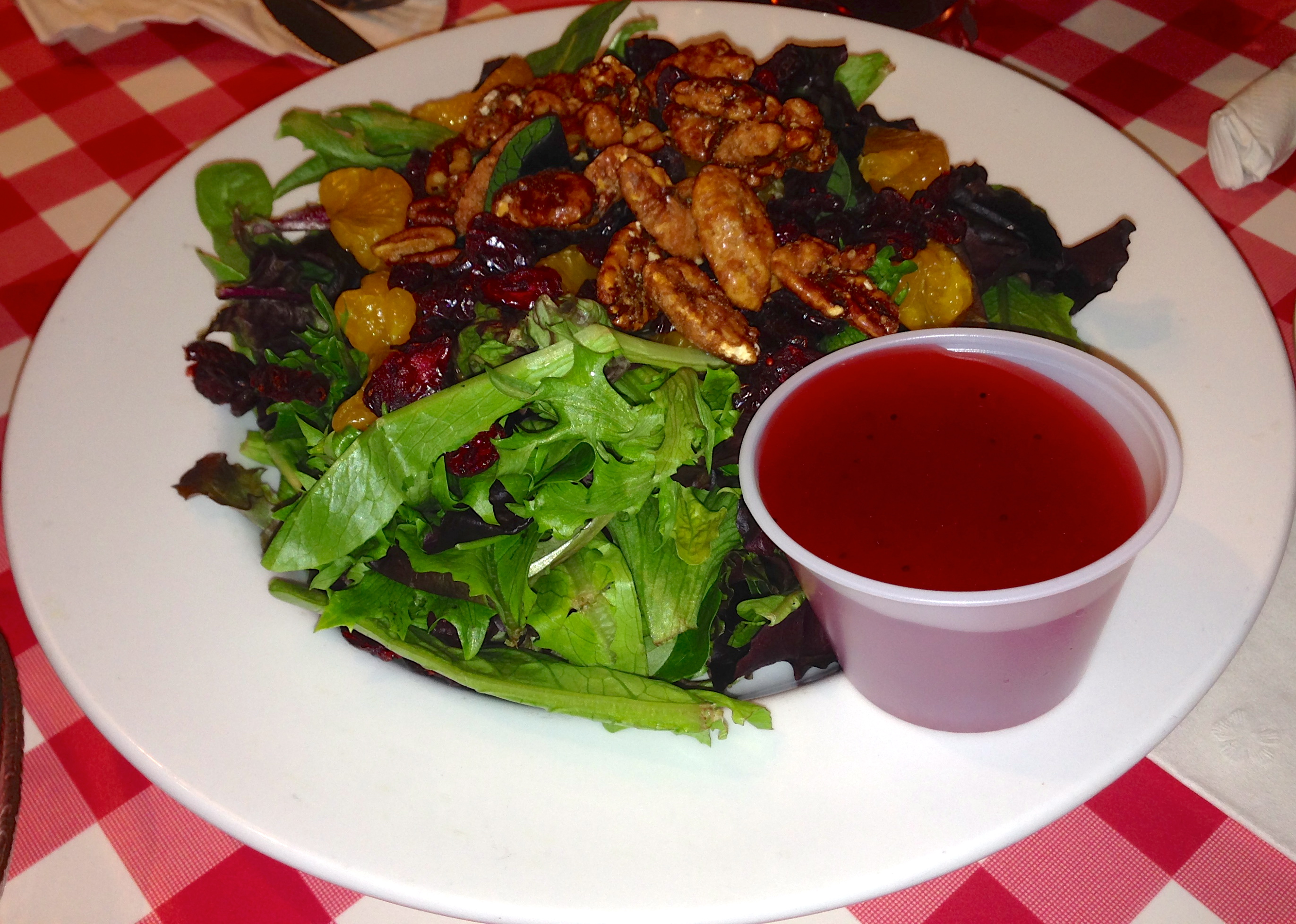 The mixed greens come with craisins, oranges, and glazed pecans. This is a huge salad and it could be divided at least four ways. The pecans are a nice touch and infuse a bit of sweetness with the raspberry vinaigrette dressing.