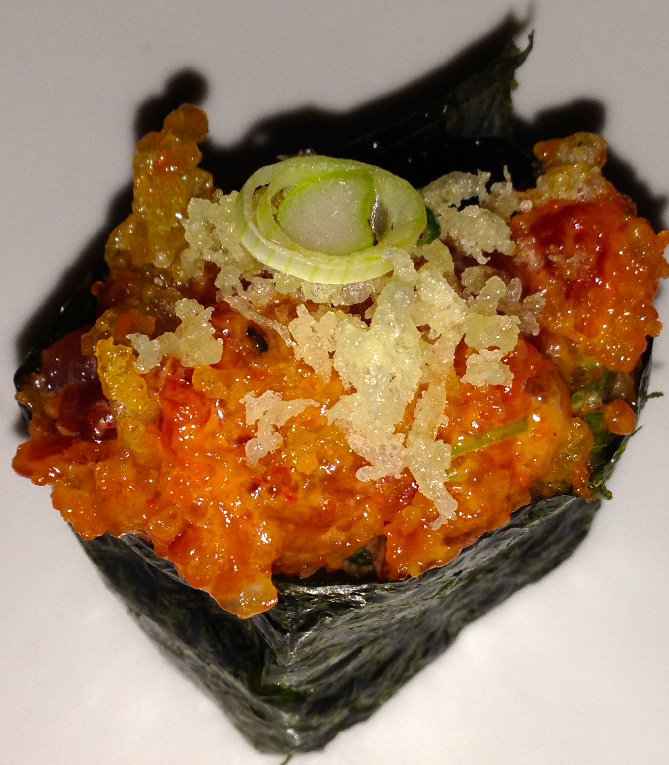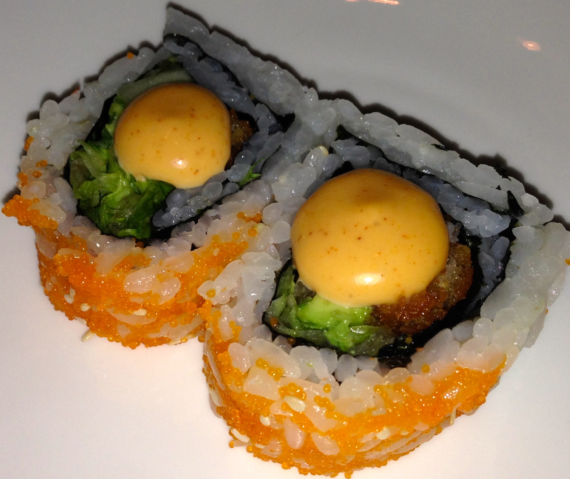 The spicy mayonnaise tops the caliente roll, rice with a crunchy piece of fried fish in the middle. This roll was not too spicy, and we liked the crunch of the fish, offset with the soft rice.