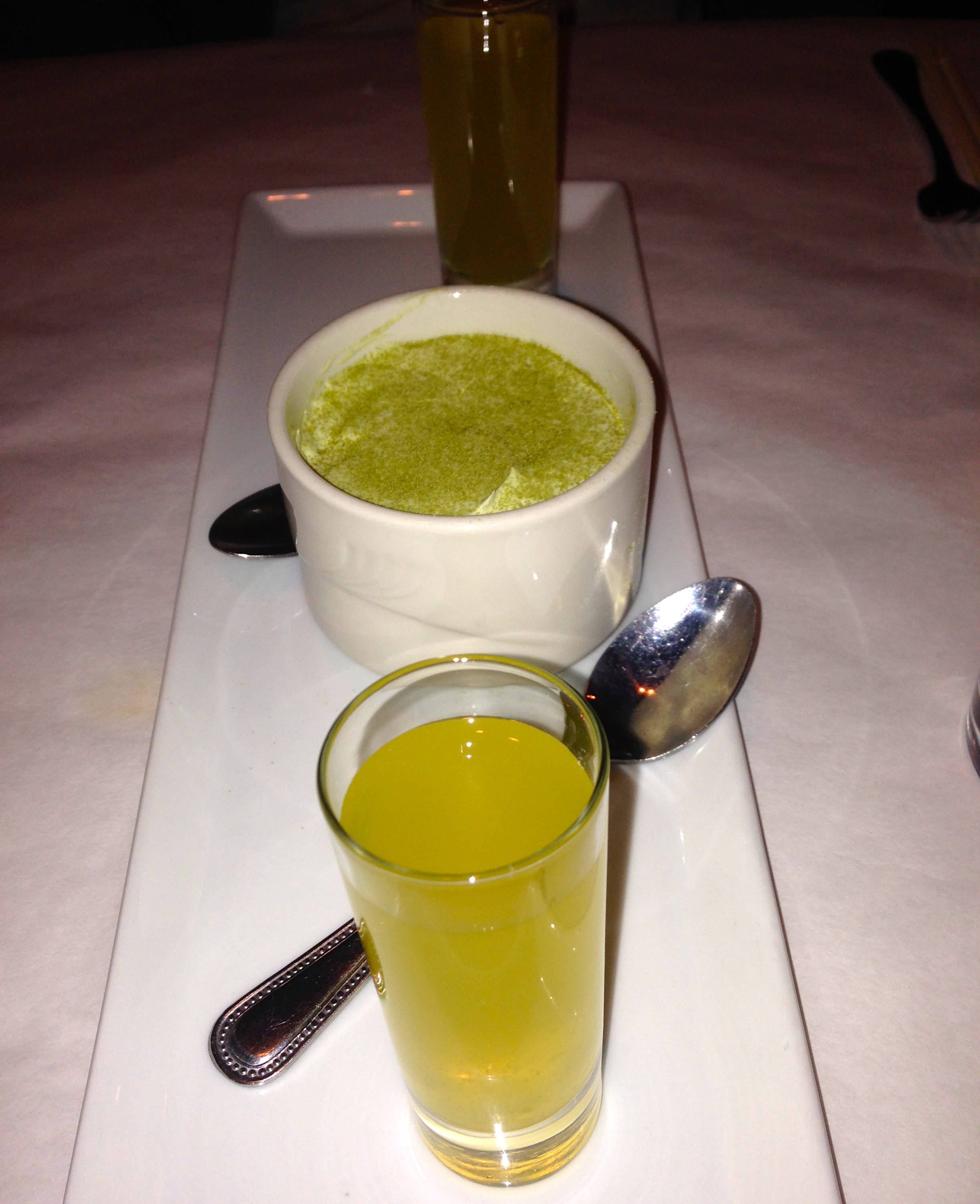Chef Nick has come up with an interesting concept for his desserts. Included with each dish is a cordial to complement the flavor and coloring of the dessert. The first presentation is the green tea tiramisu.