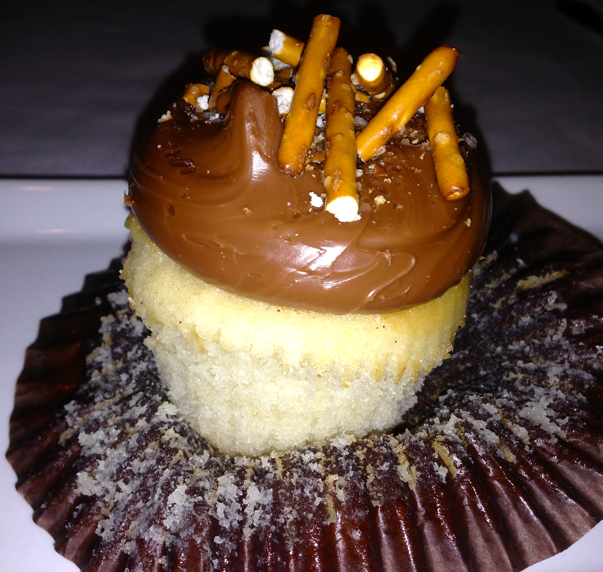 A salted caramel pretzel cupcake comes out next. The cake and caramel are dense and the salty pretzels on top are a nice touch not often seen on dessert. The (not pictured) cordial is a mix of tequila and Sapporo beer.