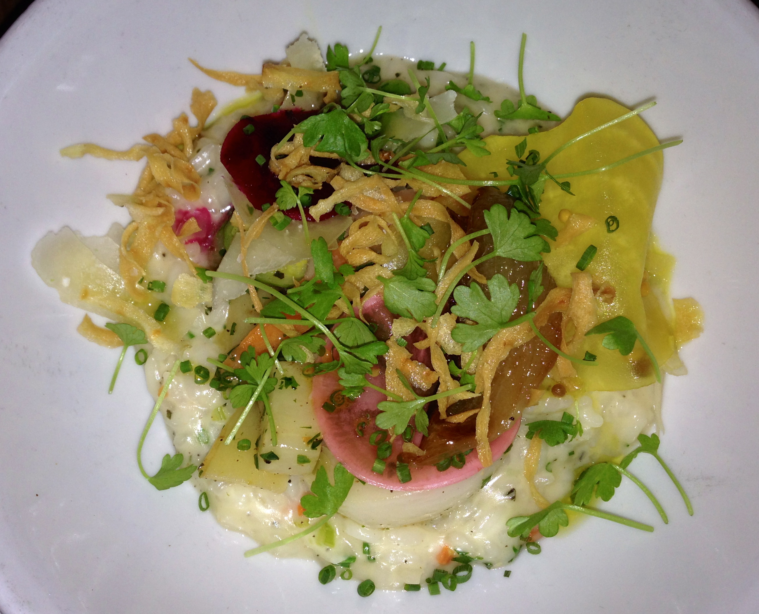 The picture is of half an order. You can easily share this if your date wants to. The creamy risotto is topped with root vegetables. Tonight, we get beets, Brussels sprouts, turnips, carrots, onions atop our Italian rice. It’s gluten free and vegetarian, so it must be good for us!