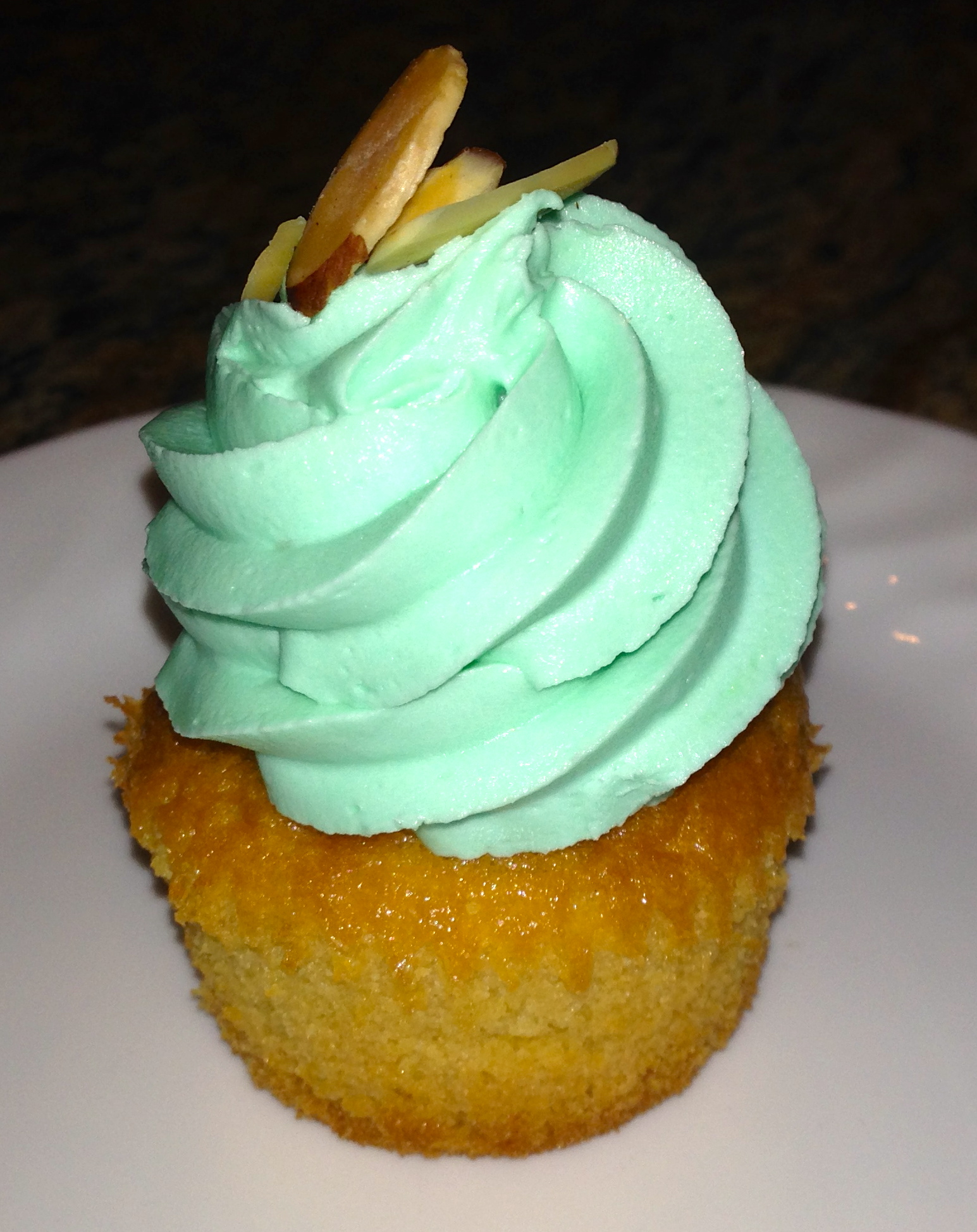Is the person who invented the cupcake container a millionaire? It seems like a lot of plastic waste to the tree hugger in me. Back to the cupcakes, we select an almond cake with green icing.