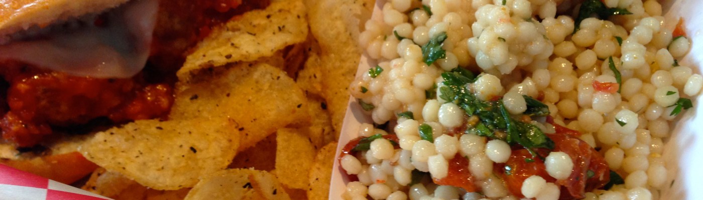 My sandwich is not as substantial. The Super Mario is a meatball sandwich, with black olive tapenade on the bread. I order a side of pearl couscous, which may be better than the sandwich. The white balsamic vinegar dressing on the couscous is delicious and imparts a wonderful citrus taste into the side.