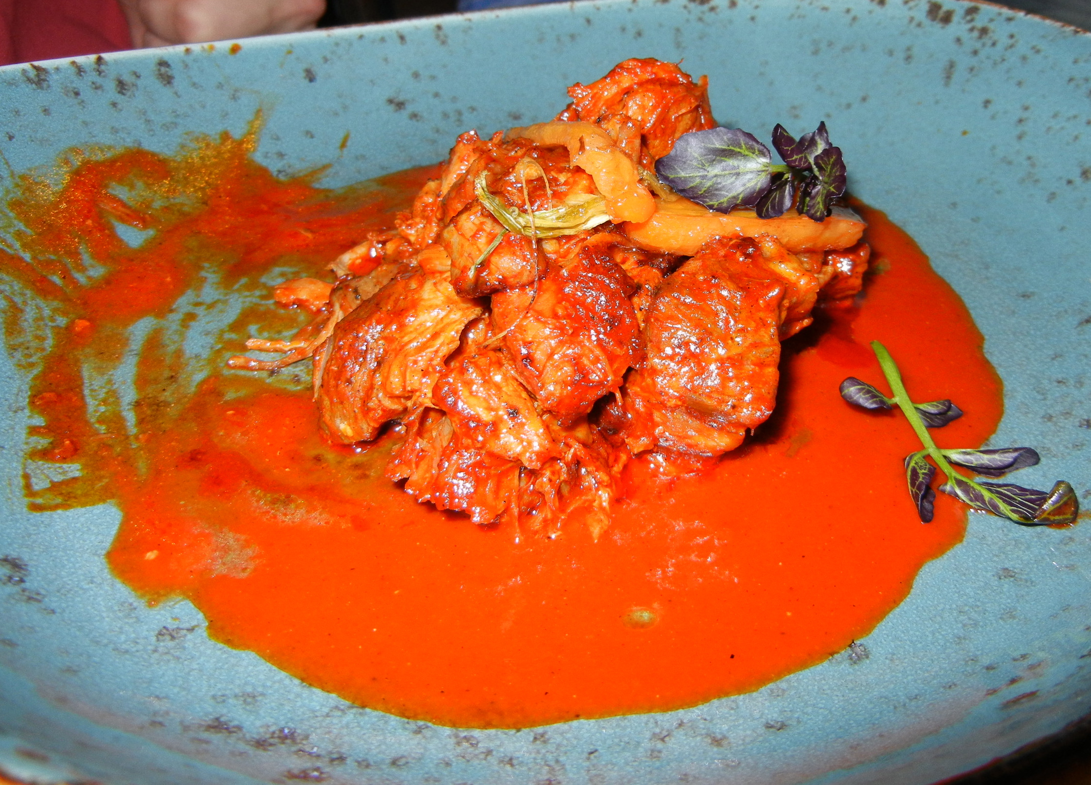 Here’s a shot of the pork carnitas, which arrive with orange/beer sauce and roasted carrots. I don’t get a taste of this, but the starving college student who ordered it really enjoyed it.