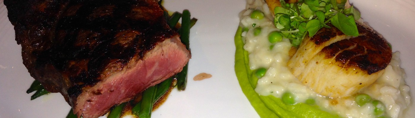 The main event is served next, a surf and turf featuring NY sirloin, scallops and pea risotto. I’m not a scallops guy, but I would become one if they were all served like this. They are huge and pan seared, which gives them a browned outer crisp while keeping them nice and juicy inside. The steak is a little on the rare side. I would have liked it cooked for 60 more seconds, but I wasn’t going to send it back. We are full, and take some home for lunch the next day, and it cooks up perfectly on the reheat.