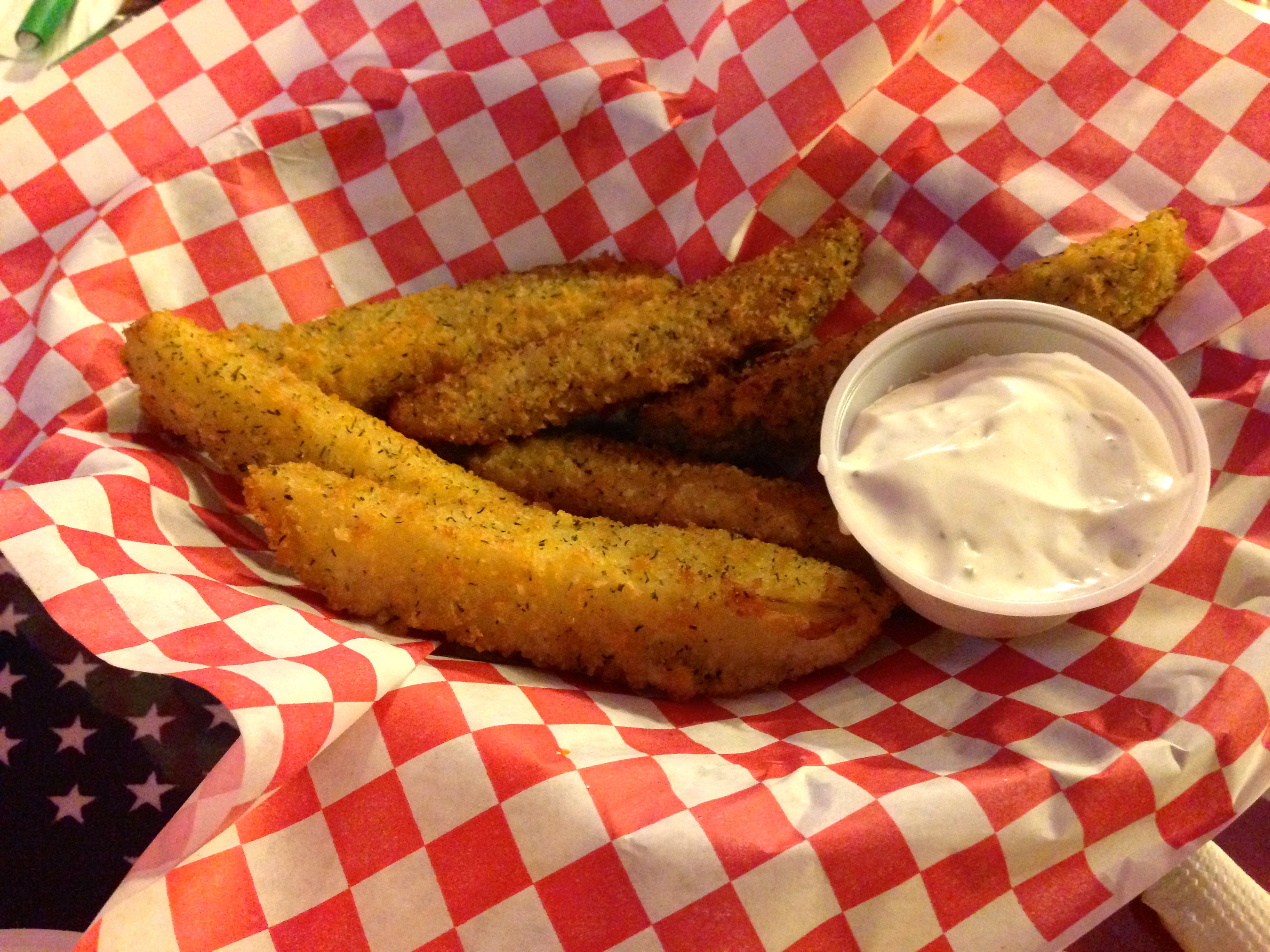 Everything is done big. There are no fried pickle chips on this menu. Instead, you get the whole pickle spear. Dip it in the ranch dressing and you get an excellent appetizer.
