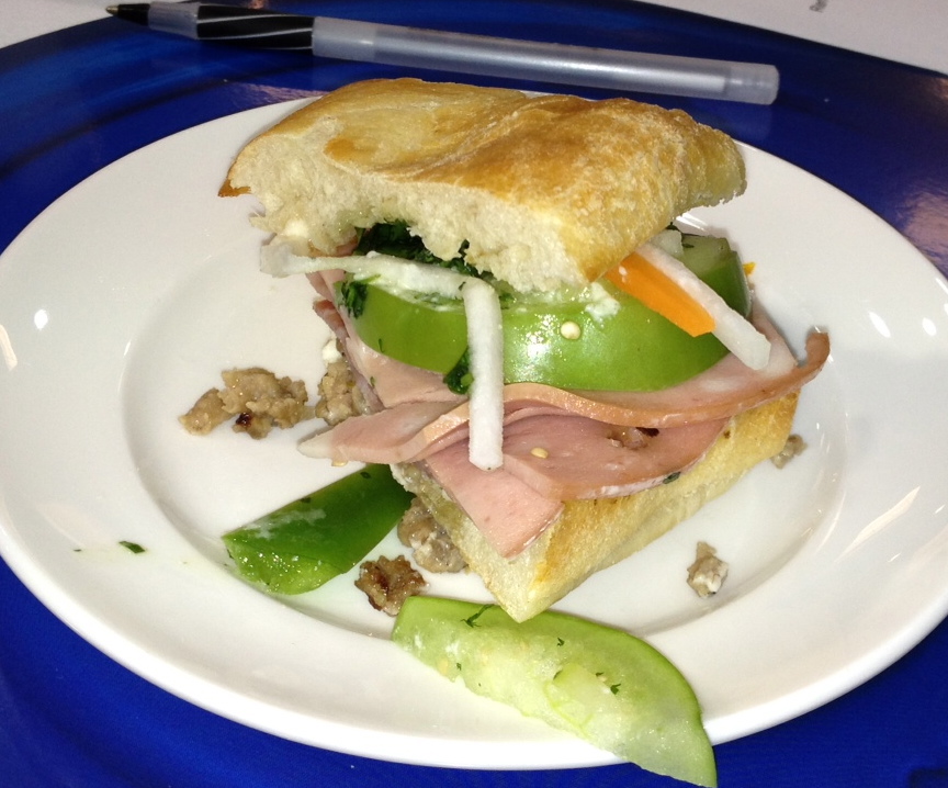 Next is a Banh Mi sandwich for “lunch”. It contains meats, kimchi, tomatillo, peppers and it reminds me of a Po-boy.