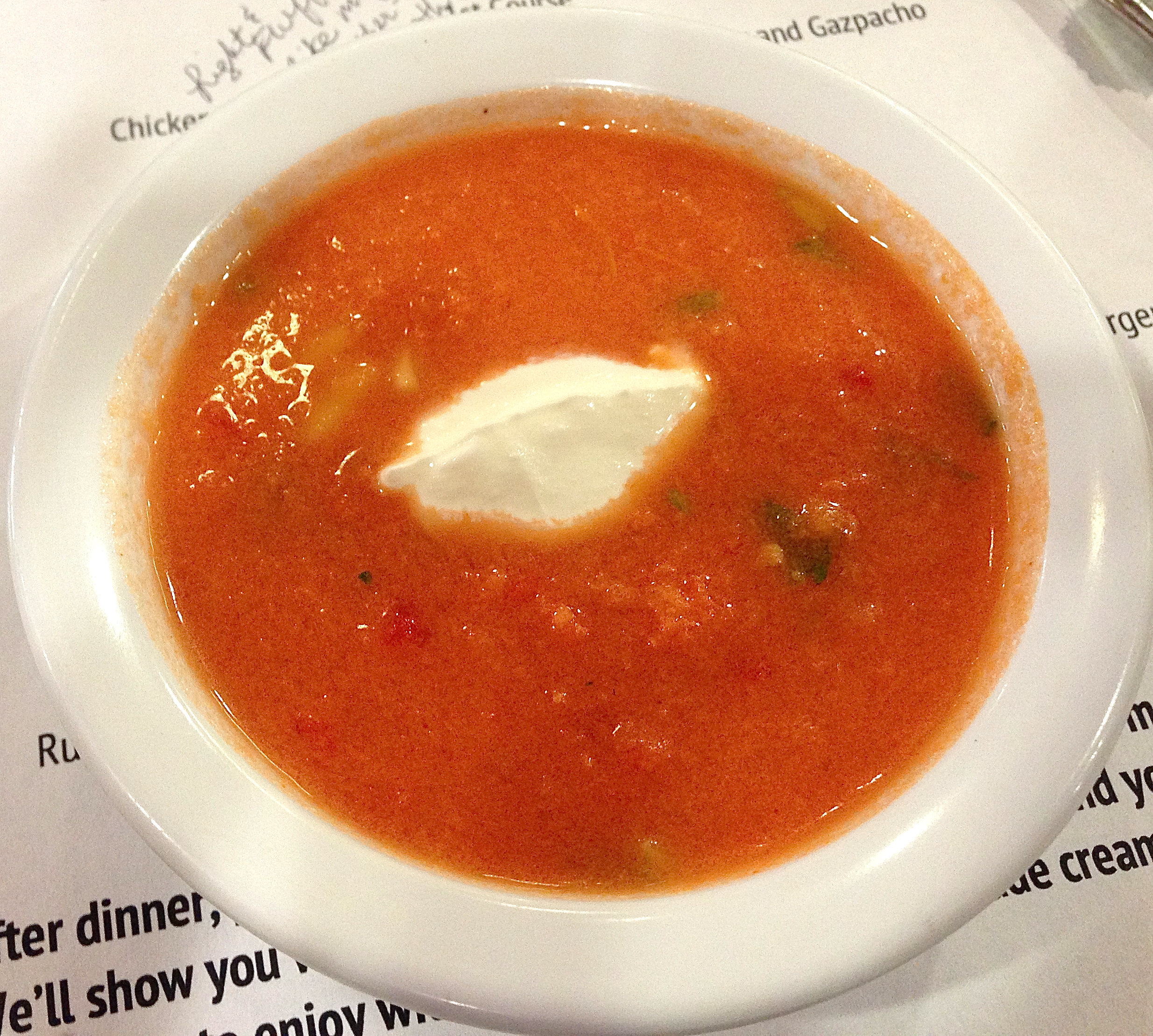 The gazpacho is a pleasant summer surprise. It’s served cold and tastes like salsa in a bowl.