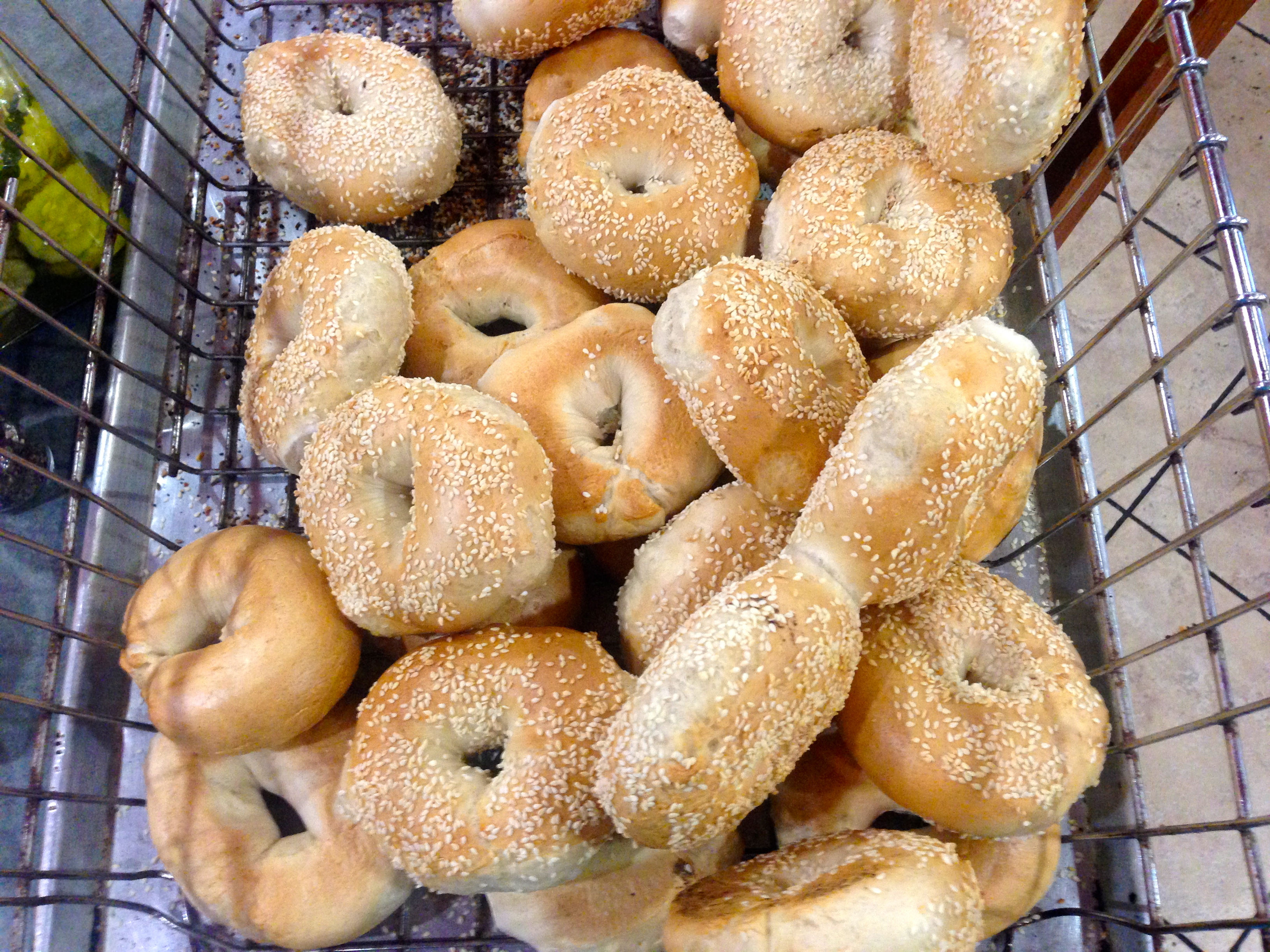 Hot, yummy bagels, that we are too full to eat! They don’t make them this way at that chain named after a brilliant physicist. We take some home for later and enjoy them the next day.